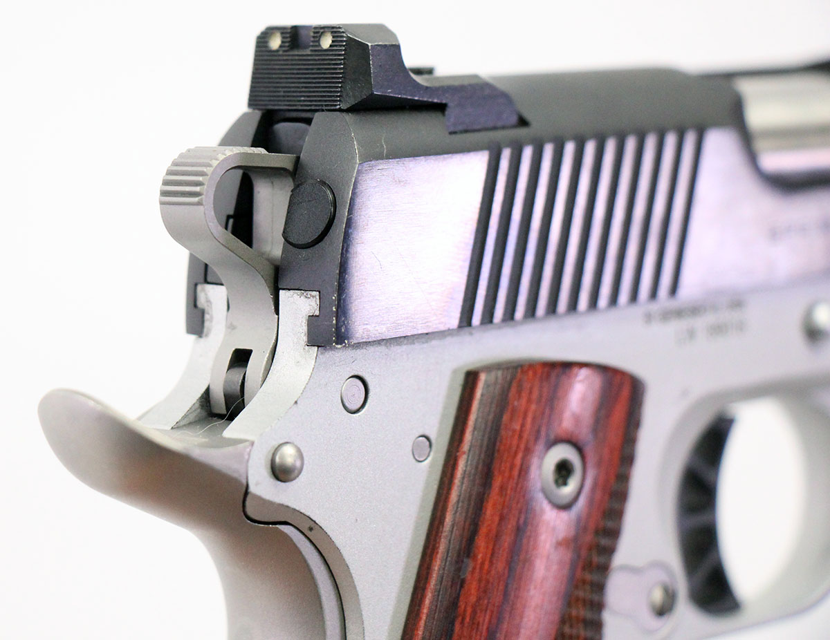 This is a used Springfield Armory Ronin pistol chambered in 45 ACP. It features a 4.25-inch barrel, 8-round magazine, thumb safety, grip safety, fiber optic front sight, wood grips, and alloy frame. Overall, this Springfield is in good condition with normal use wear on the slide and barrel. The frame has significant handling wear. This would be a good choice for home defense. Buy online today!