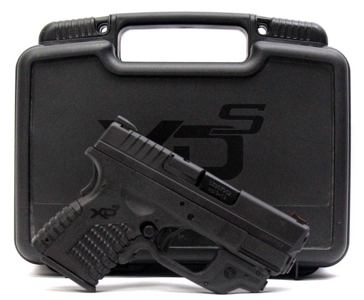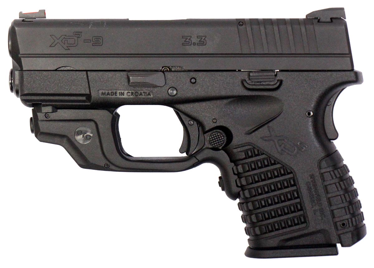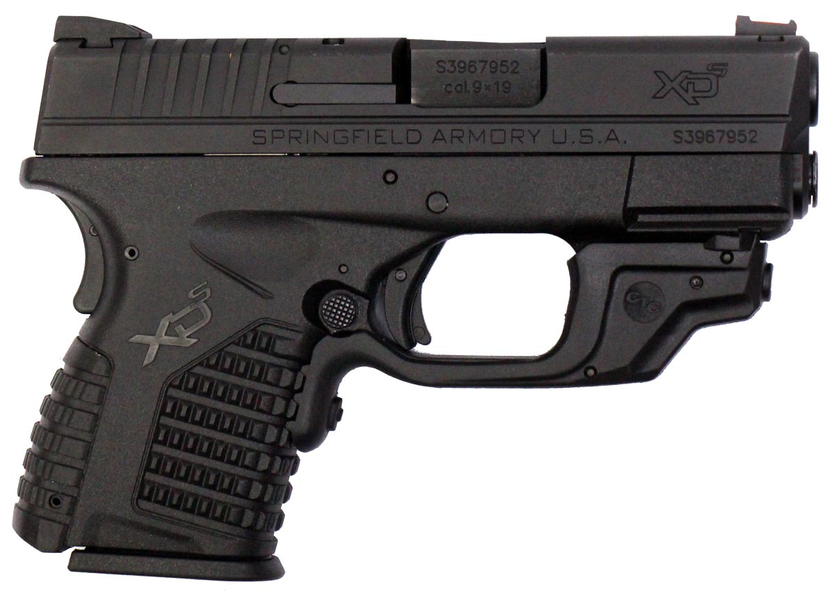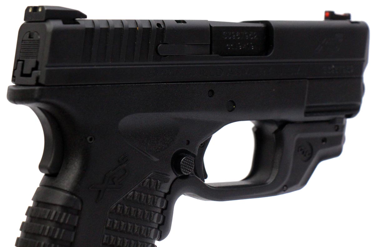 This is a used Springfield Armory XDS-9 pistol chambered in 9mm. It features a 3.3-inch barrel, 6-round magazine, grip safety, fixed sights, Crimson Trace red laser sight, and ambidextrous magazine release. Includes factory box, manual, one 6-round magazine, and one 8-round magazine. Overall, this Springfield is in good condition with normal-use wear on the slide and barrel. This would be a good choice for concealed carry. Buy online today!