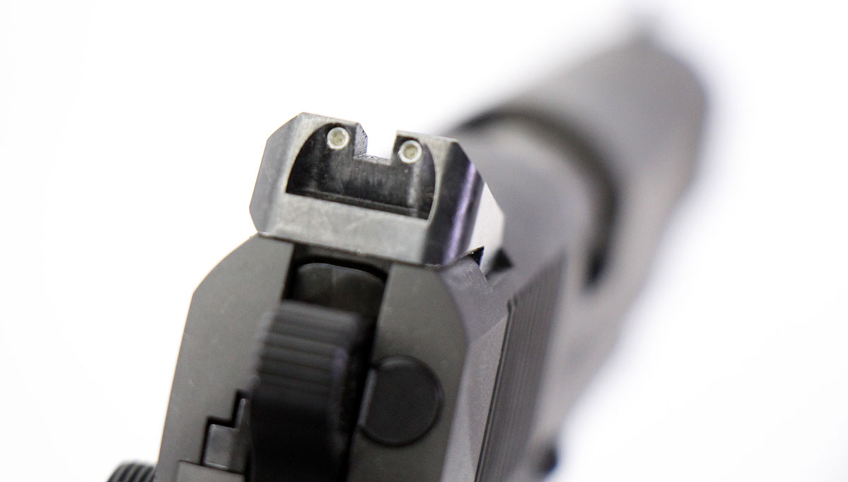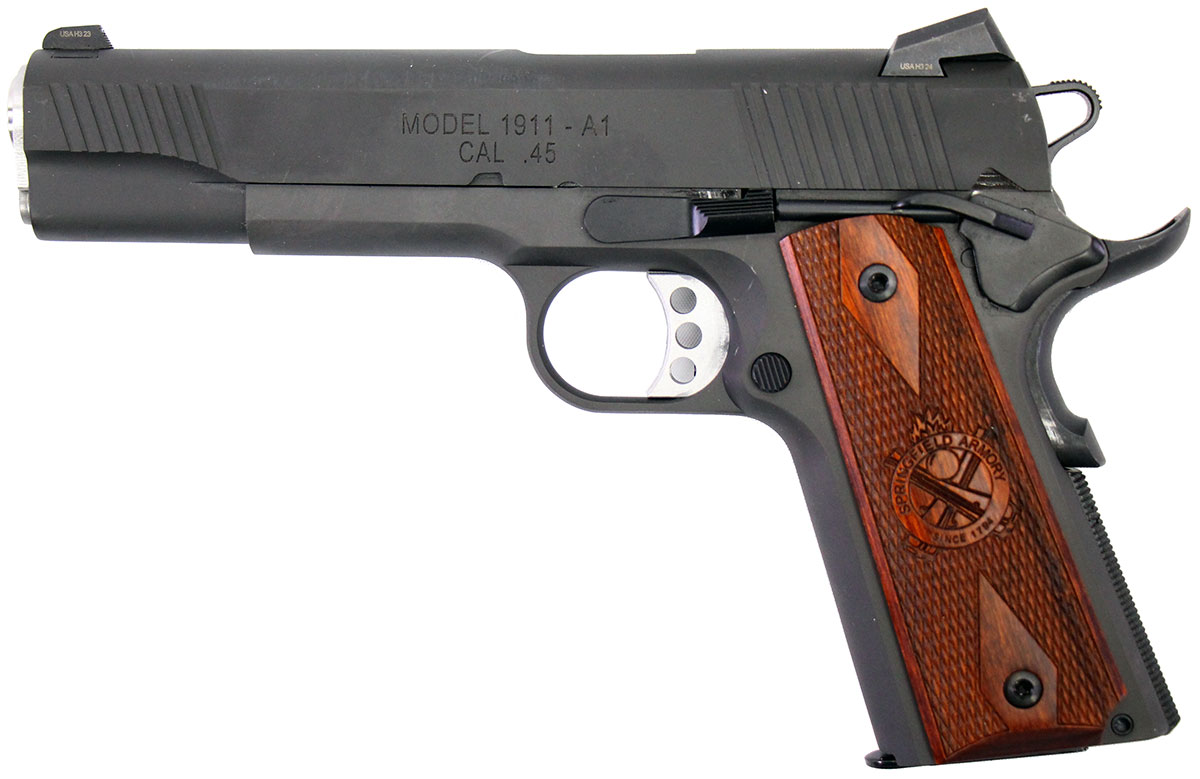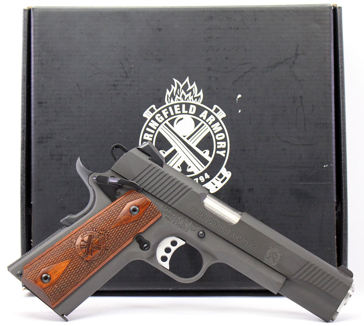 This is a used Springfield M1911-A1 Loaded pistol chambered in 45 ACP. It features a 5-inch barrel, 7-round magazine, night sights, thumb safety, grip safety, and parkerized finish. Includes factory box, nylon case, and manual. Overall, this Springfield is in good condition with normal use wear on the barrel, slide, and frame. This would be a good choice for target shooting. Buy online today!