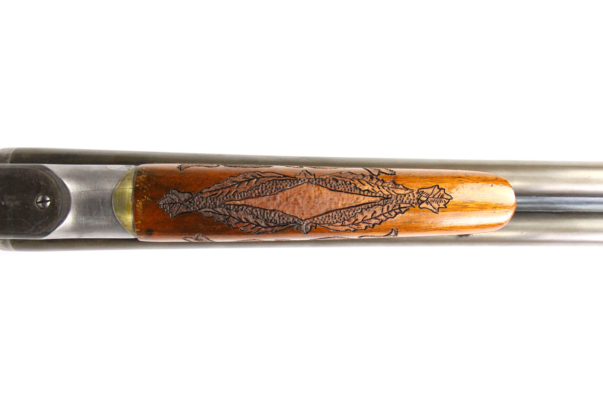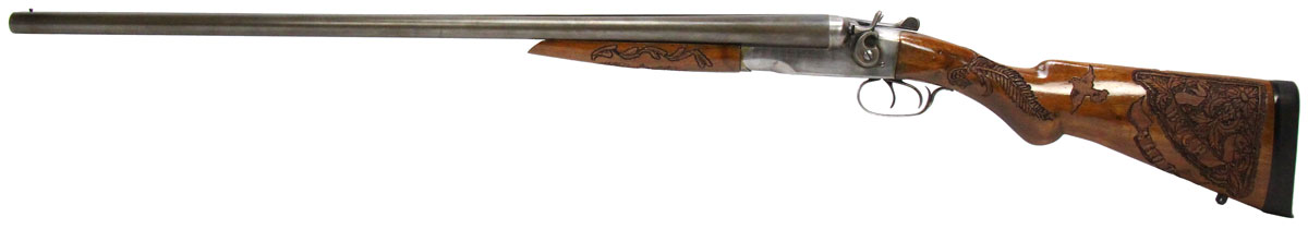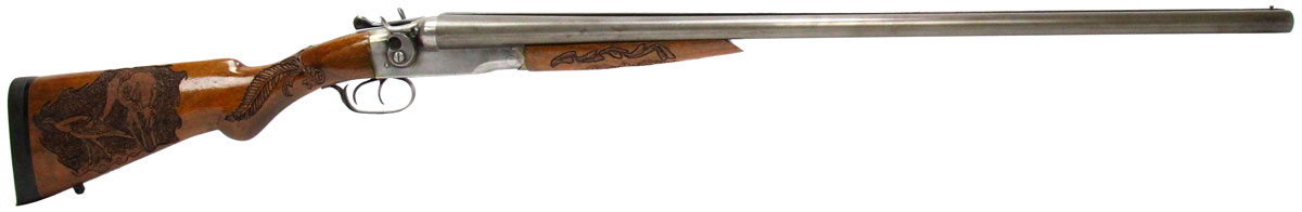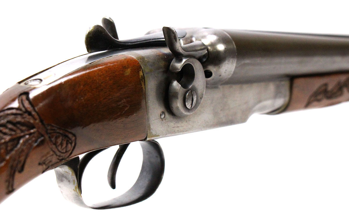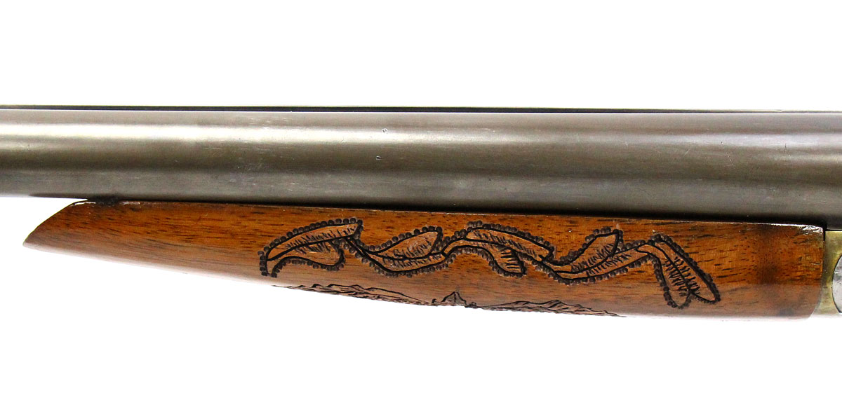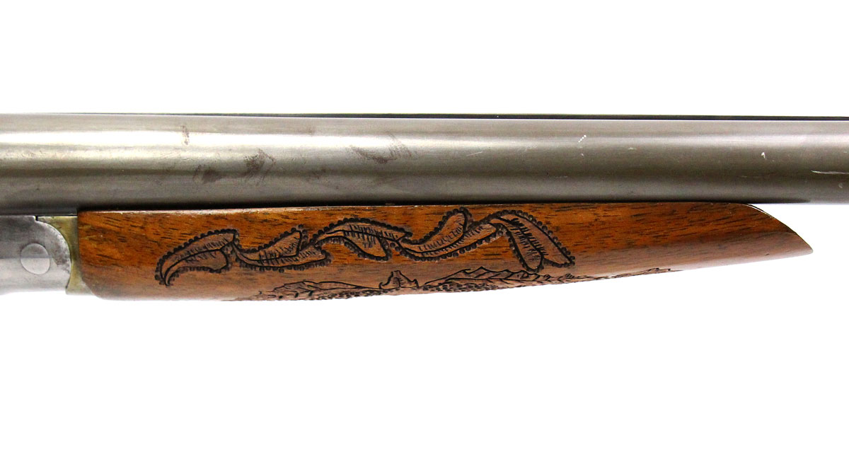 This is a used Stevens 235 shotgun chambered in 12 gauge. It features 30-inch barrels, 2.75-inch chambers, external rabbit ear hammers, custom carved stock, fixed modified choke, and fixed full choke. Overall, this shotgun is in good condition with normal age-related bluing wear throughout the barrels and receiver. This would be a good choice for hunting. Buy online today!