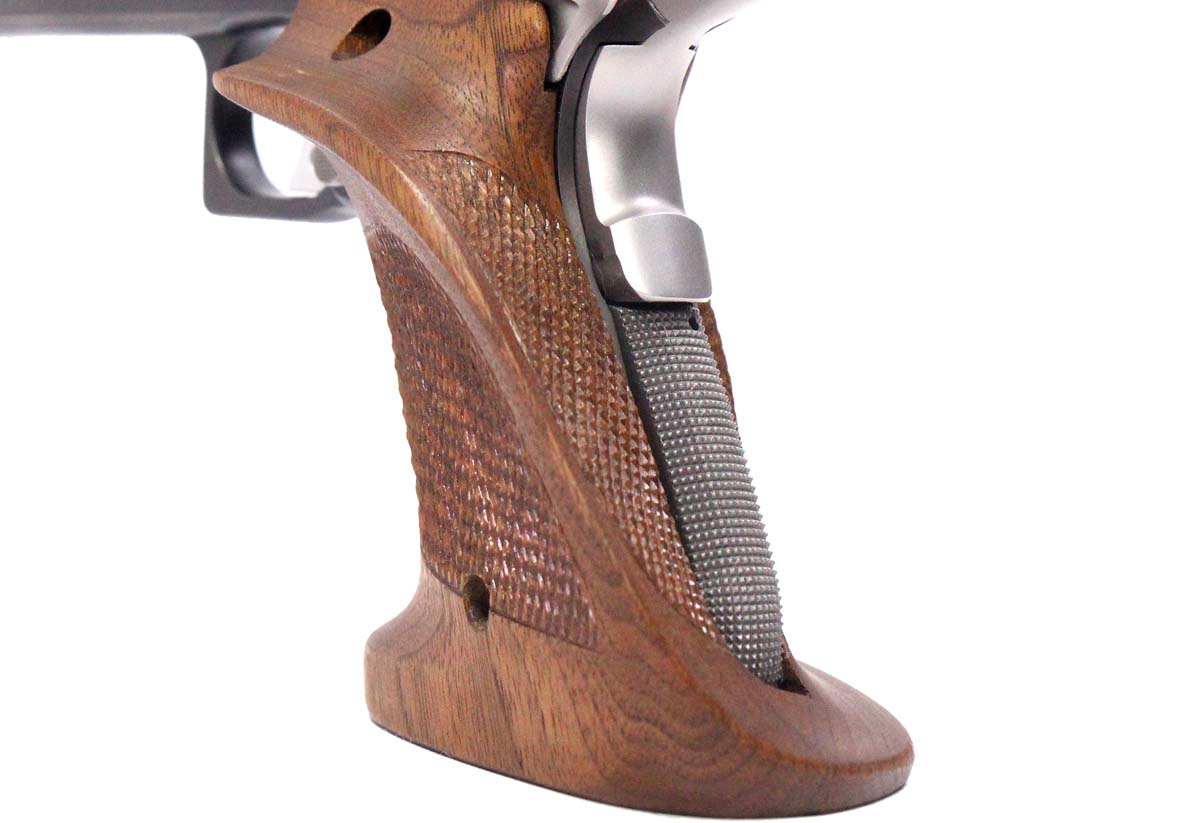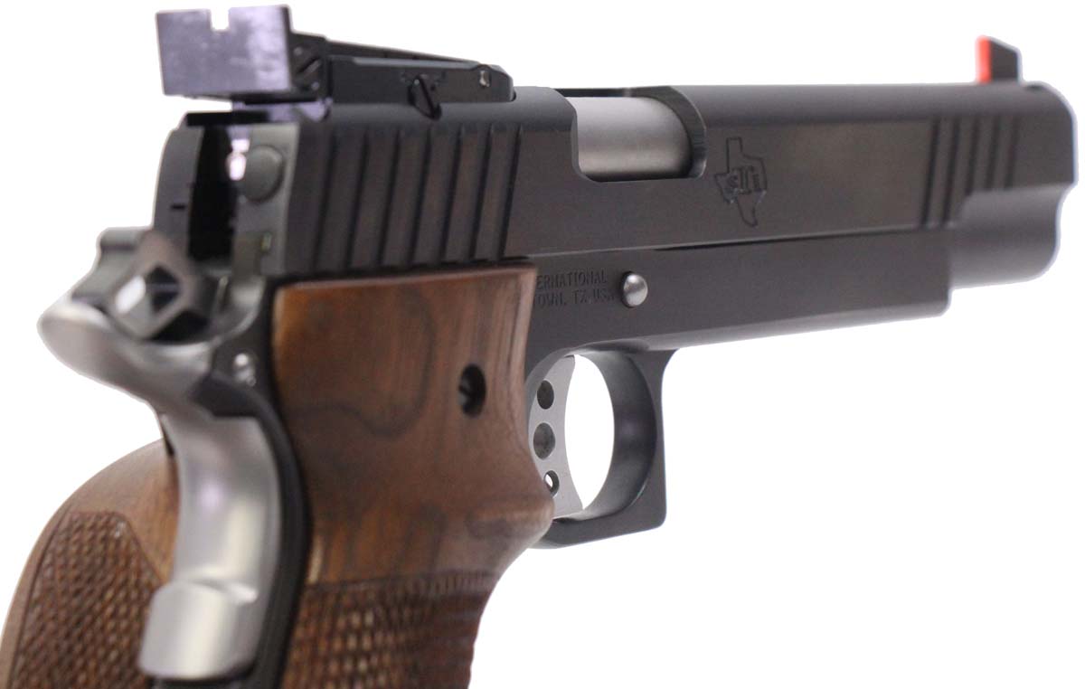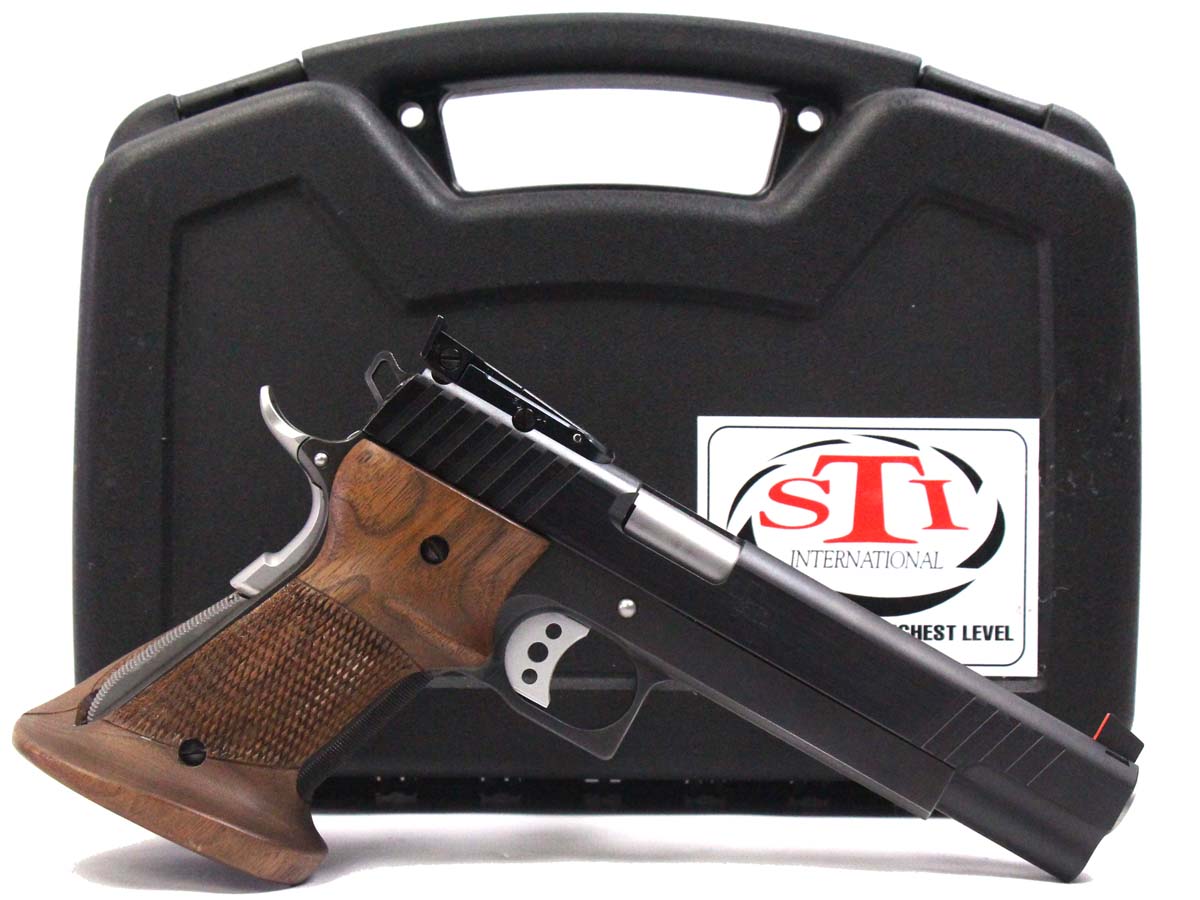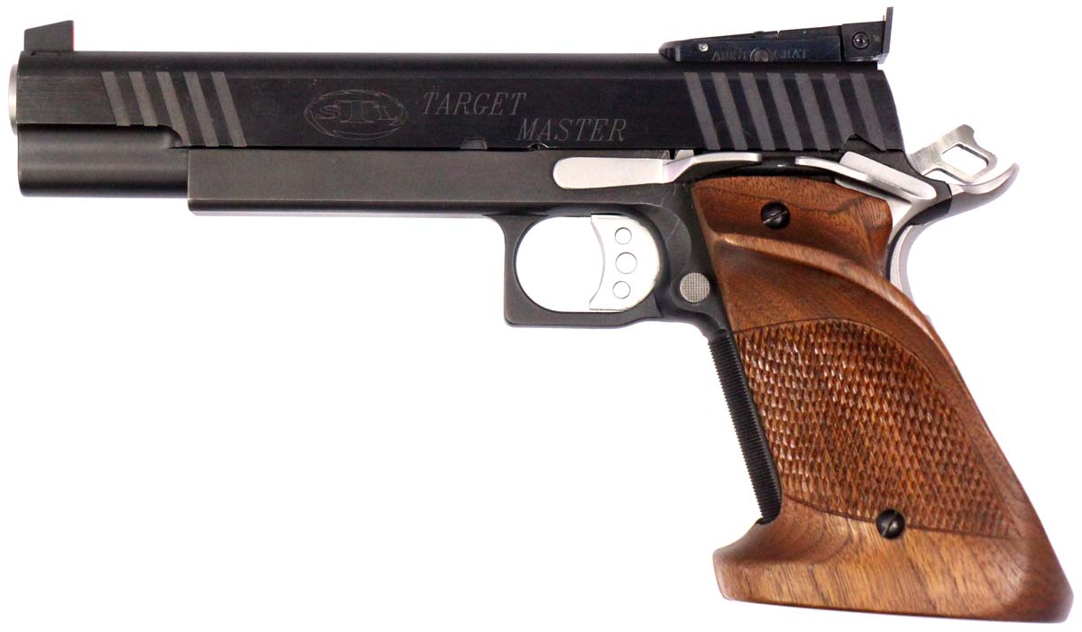 This is a used STI Target Master pistol chambered in 9mm. It features a 6-inch barrel, 8-round magazine, adjustable rear sight, thumb safety, grip safety, and right-handed wood target grips. Includes factory box, manual, and a set of OEM wood grips. Overall, this pistol is in good condition with normal use wear on the slide and barrel. This would be a good choice for target shooting. Buy online today!