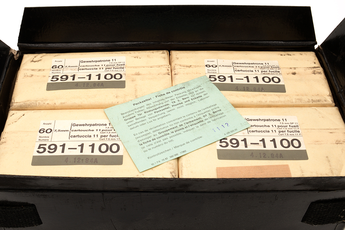 This is pre-owned Swiss GP11 match grade 7.5x55 mmmo for the Schmidt-Rubin/K31 rifle. It features 480 rounds of 174 grain FMJ bullets with brass cases in the original 1984 dated case with eight individual packages of 60 packed inside. The ammo is in original "as shipped" condition from the factory. Buy online today!