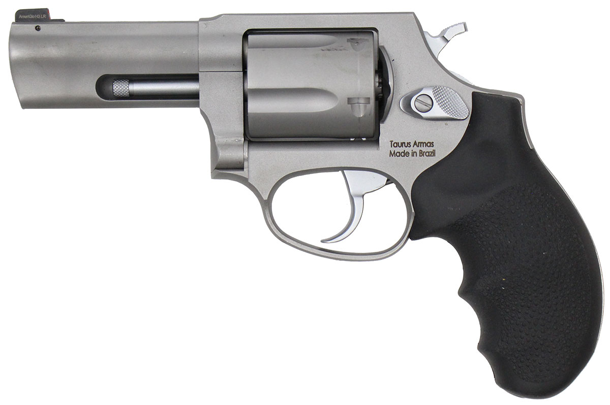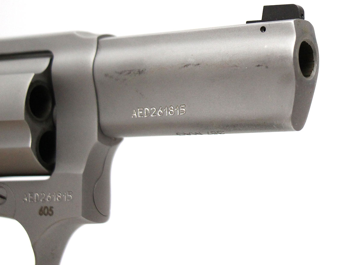 This is a used Taurus 605 revolver chambered in 357 Magnum. It features a 3-inch barrel, 5-round cylinder, tritium front sight, rubber grips, and stainless finish. Overall, this Taurus is in good condition with normal use cylinder draglines. This would be a good choice for concealed carry. Buy online today!