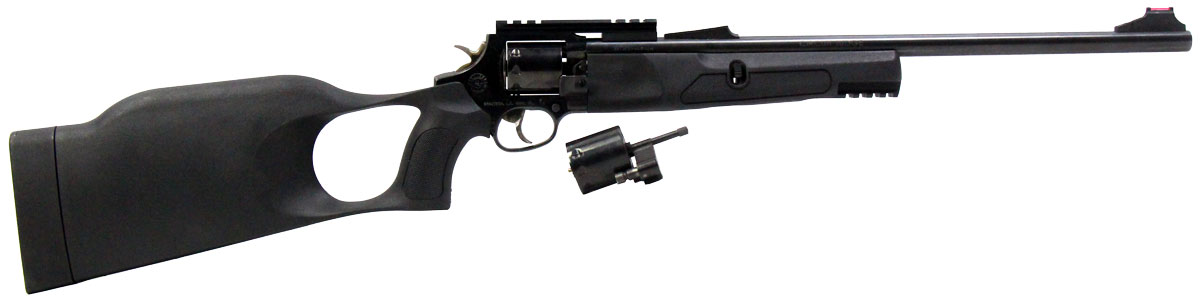 This is a used Taurus Circuit Judge rifle chambered in 22 Long Rifle and 22 Magnum. It features an 18.5-inch barrel, 9-round cylinders, scope base, and synthetic stock. Includes 22 Long Rifle and 22 Magnum cylinders. Overall, this rifle is in good condition with normal use cylinder turn lines. The rear sight is missing. Bore condition is good with crisp rifling. This would be a good choice for target shooting or small game hunting. Buy online today!
