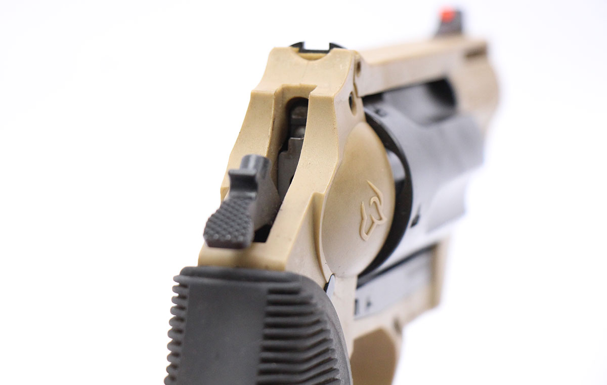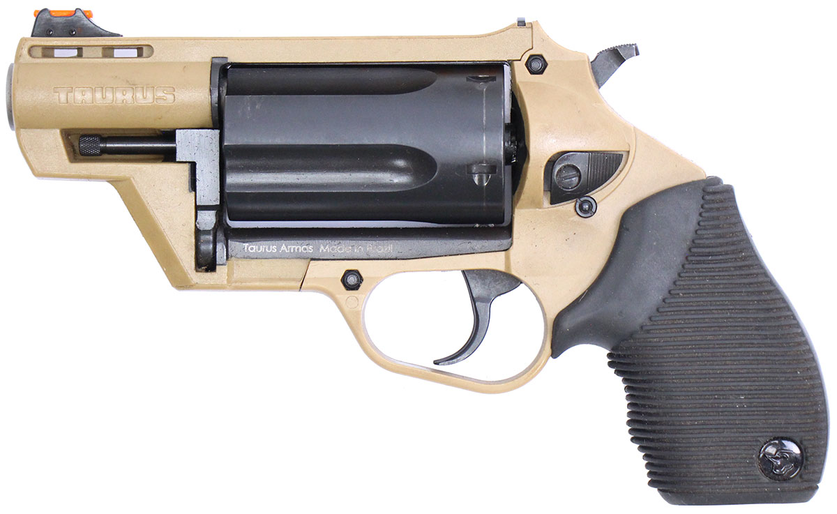 This is a used Taurus Judge Public Defender Poly revolver chambered for 45 Long Colt and 410 shot shells. It features a 2-inch barrel, 5-round cylinder, fiber optic front sight, rubber grips, internal lock, and flat dark earth polymer frame. Includes factory box, manual, and internal lock keys. Overall, this Taurus is in good condition with normal cylinder draglines. This would be a good choice for home defense. Buy online today!