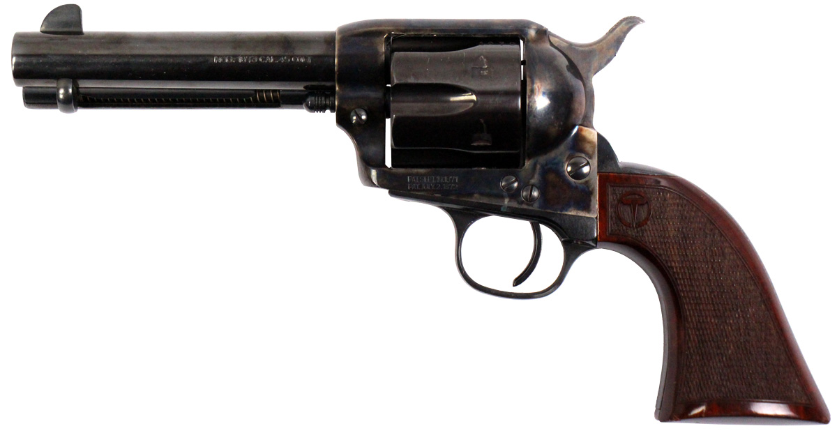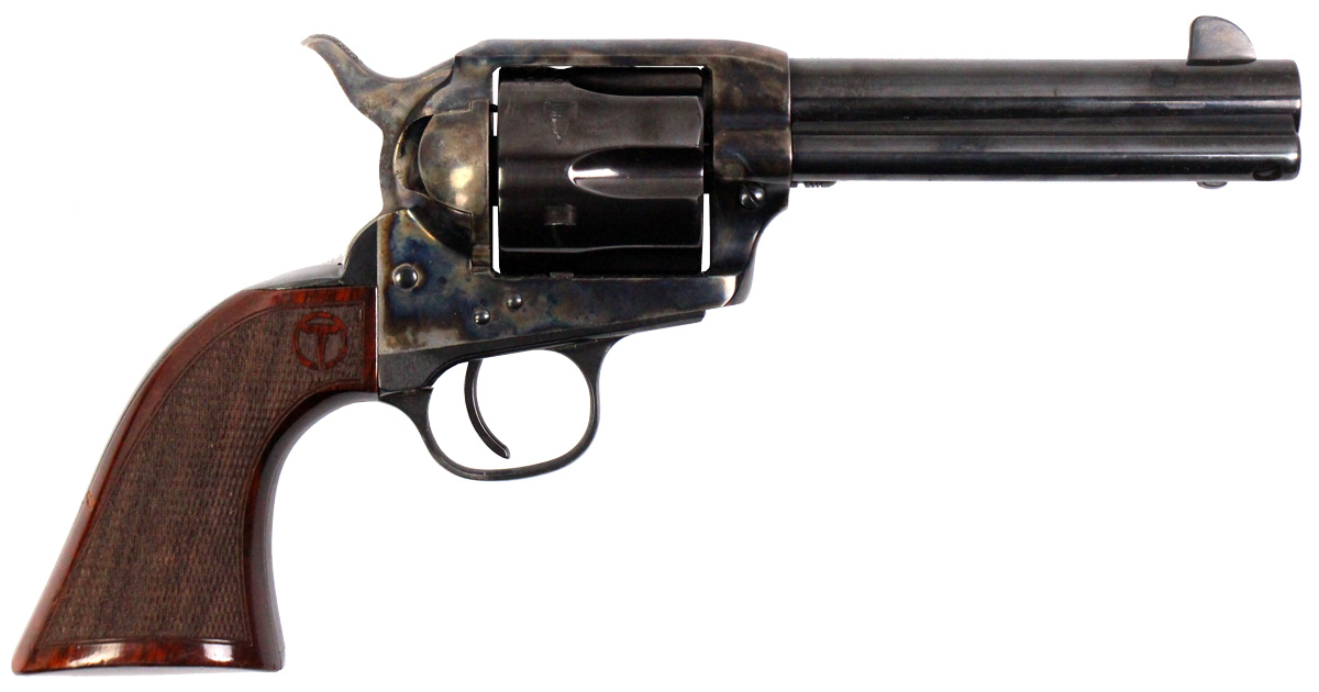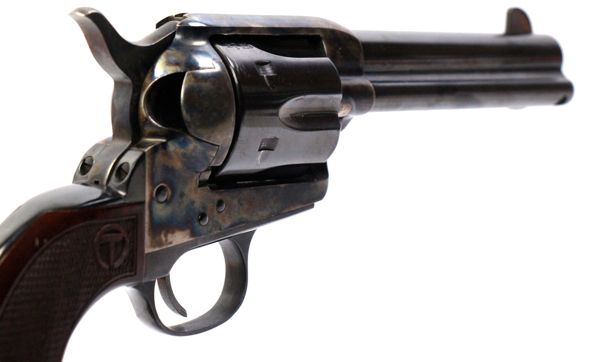 This is a used Taylor's & Co. 1873 revolver chambered in 45 Long Colt. It features a 4.75-inch barrel, 6-round cylinder, case color finish, no transfer bar safety, and wood grips. Overall, this revolver is in good condition with normal use cylinder turn lines. This would be a good choice for recreational target shooting or cowboy action competition. Buy online today!