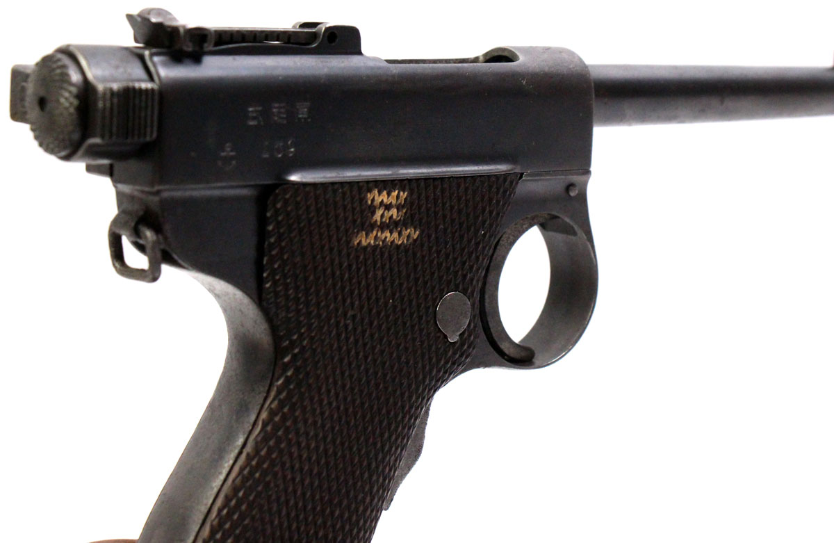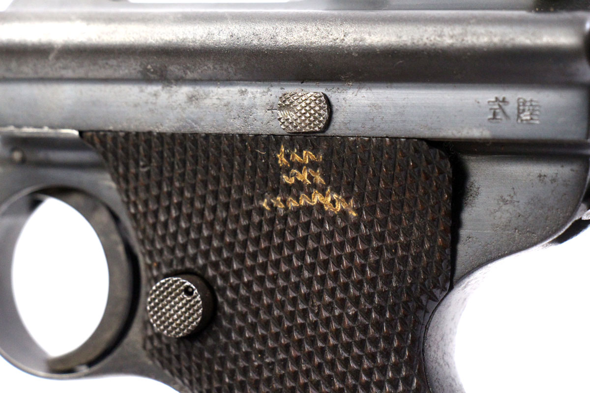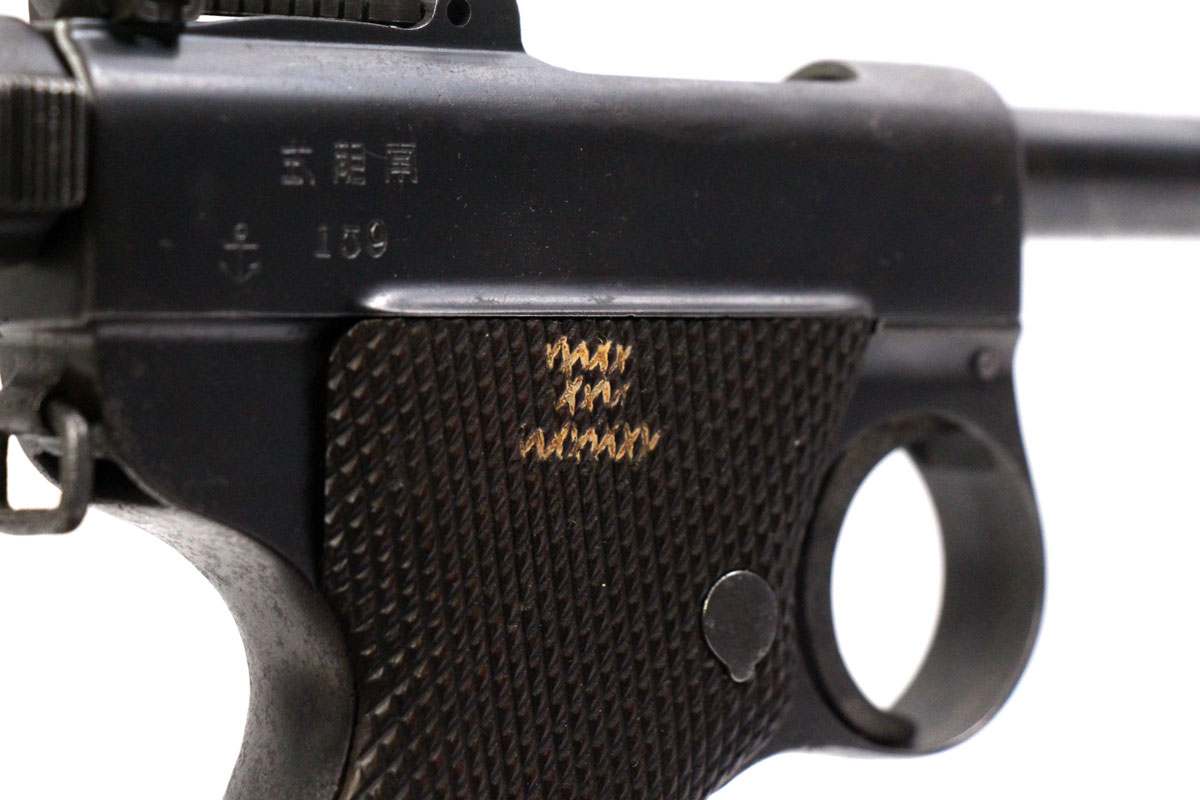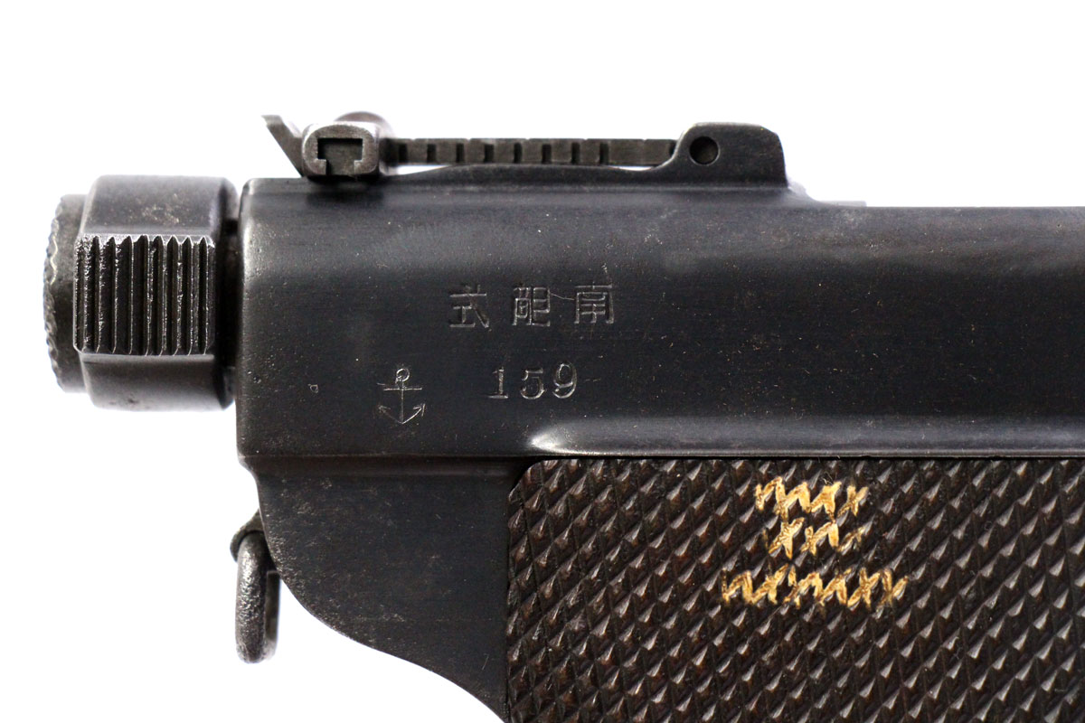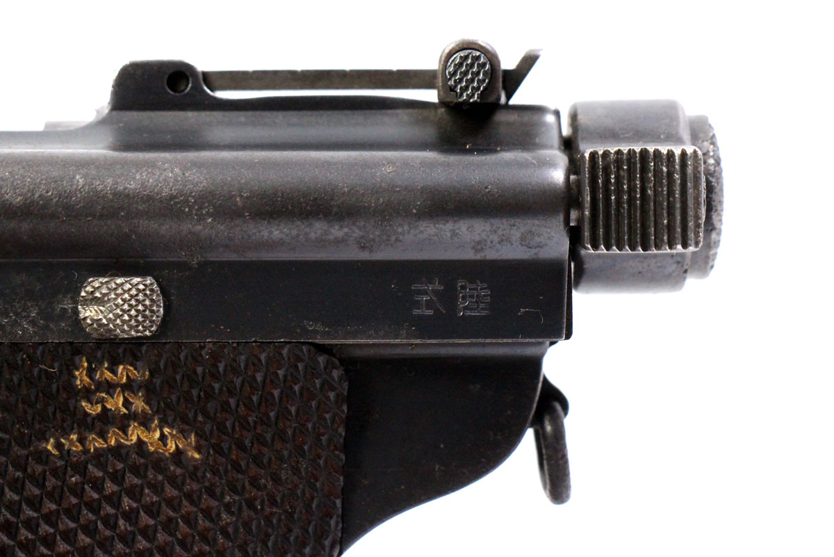 This is a classic navy contract Tokyo Gas and Electric Papa Nambu pistol chambered in 8x22mm. It features a 4.75-inch barrel, 8-round magazine, grip safety, tangent rear sight, lanyard ring, and wood grips. Includes leather holster and what appears to be a capture tag. Overall, this pistol is in good condition with significant pitting throughout the barrel and frame. The holster is in fair condition with normal age-related wear, the strap has a tear in it near the buckle. The magazine is mismatched from the gun. There is a naval anchor stamp next to the serial number and a Tokyo Gas and Electric stamp is visible on the chamber. This would be a good choice for military surplus collectors. Buy online today!