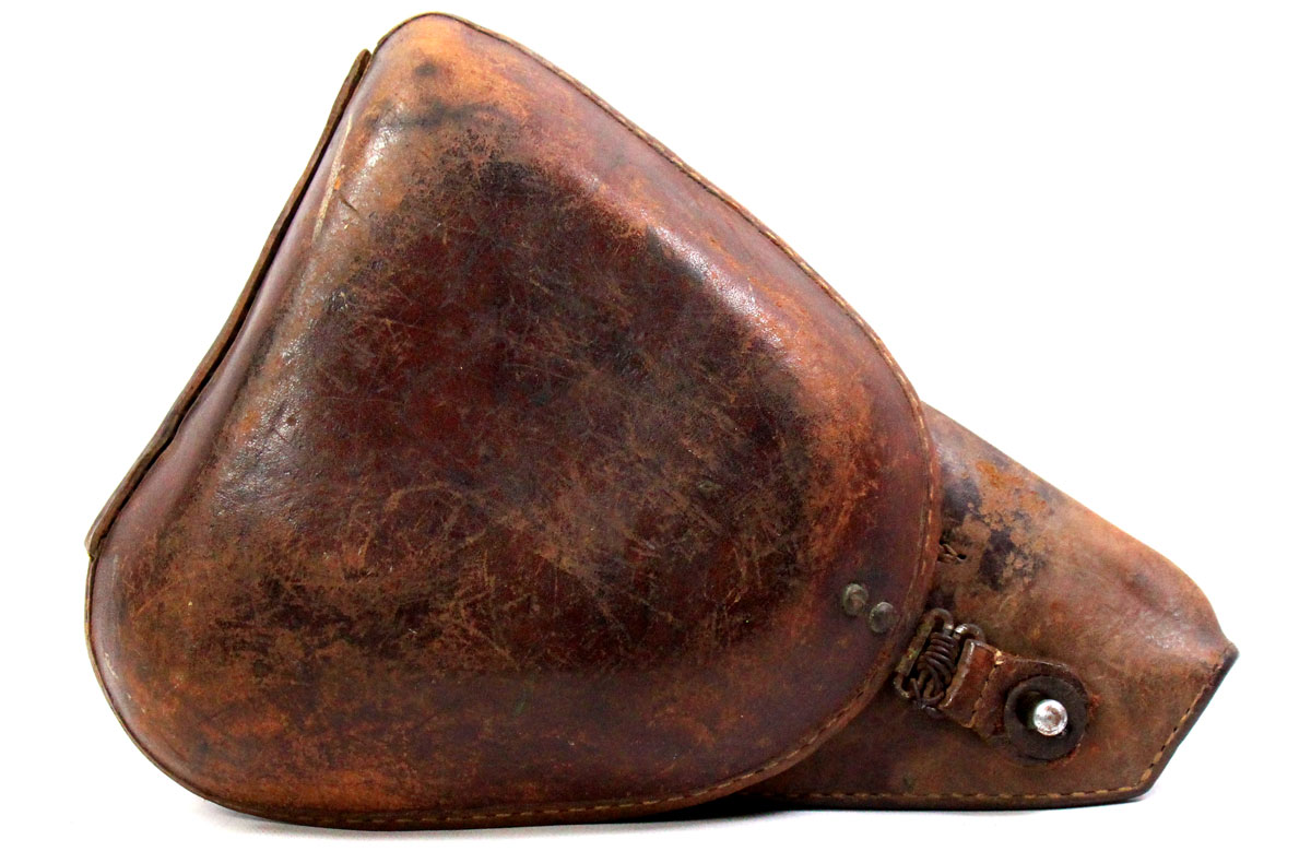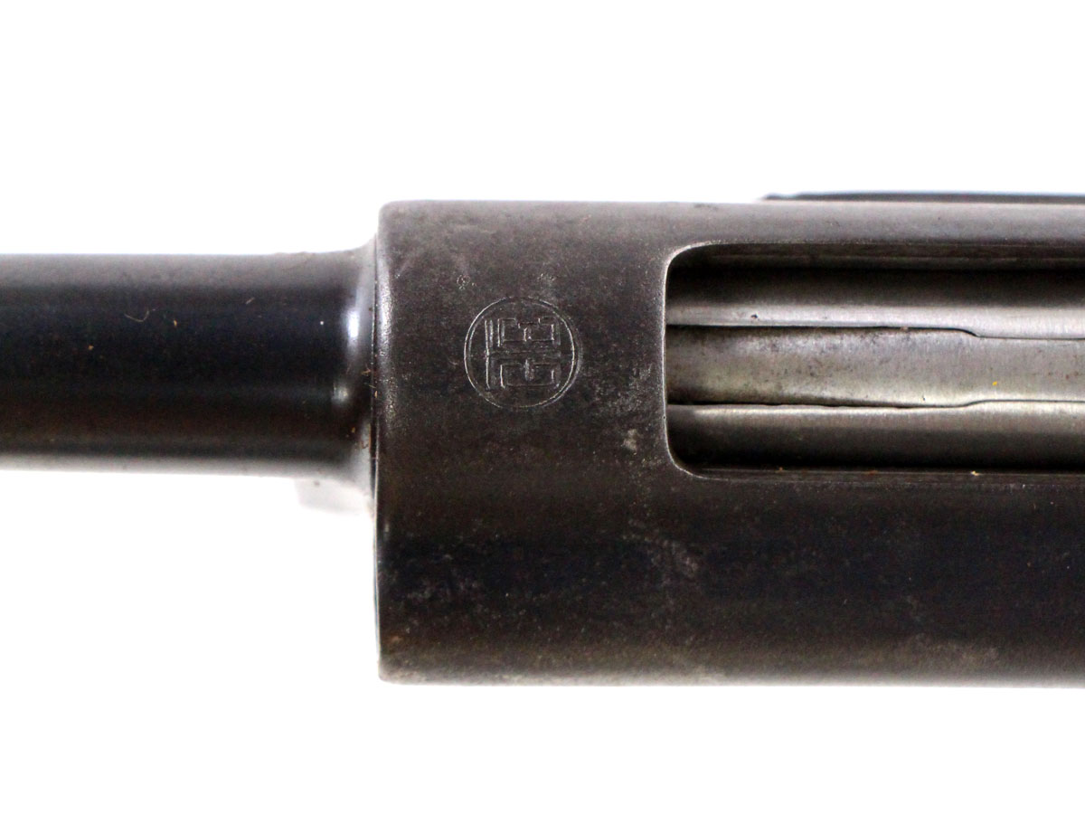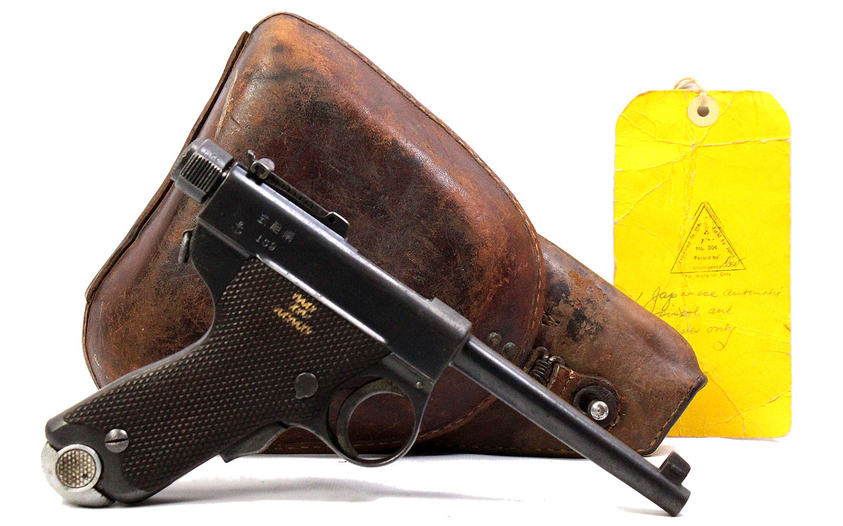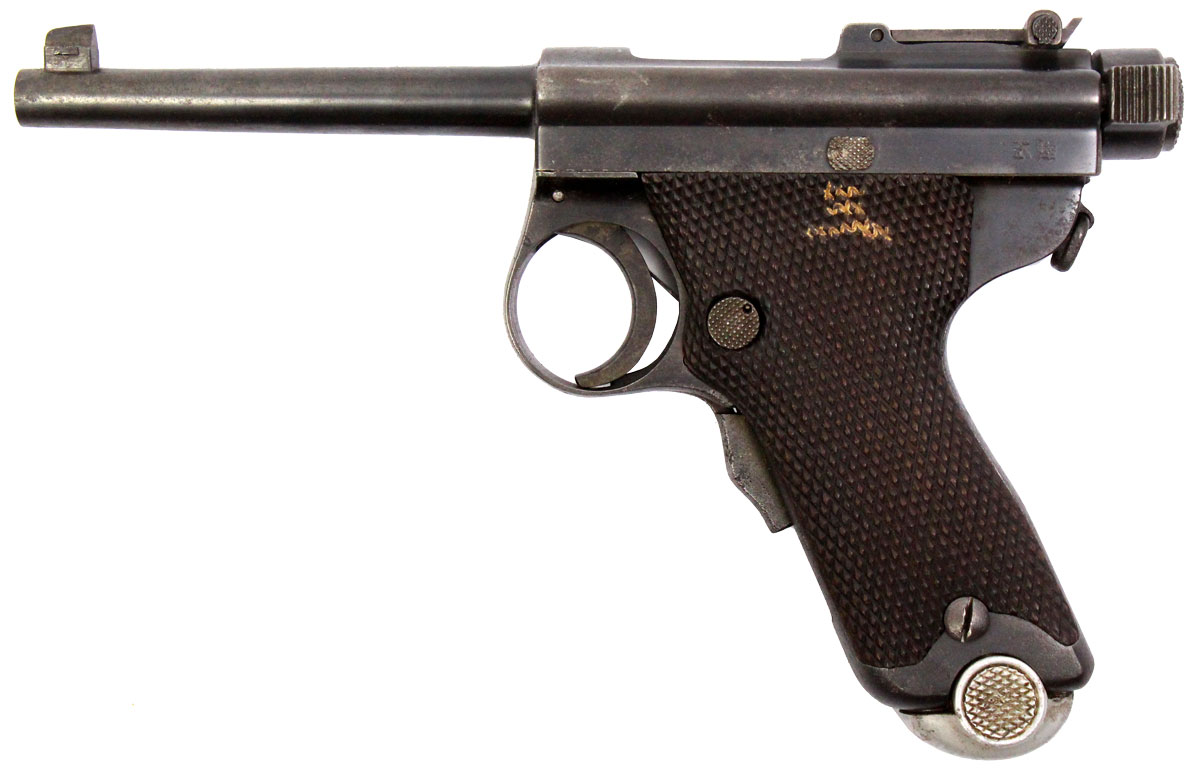 This is a classic navy contract Tokyo Gas and Electric Papa Nambu pistol chambered in 8x22mm. It features a 4.75-inch barrel, 8-round magazine, grip safety, tangent rear sight, lanyard ring, and wood grips. Includes leather holster and what appears to be a capture tag. Overall, this pistol is in good condition with significant pitting throughout the barrel and frame. The holster is in fair condition with normal age-related wear, the strap has a tear in it near the buckle. The magazine is mismatched from the gun. There is a naval anchor stamp next to the serial number and a Tokyo Gas and Electric stamp is visible on the chamber. This would be a good choice for military surplus collectors. Buy online today!