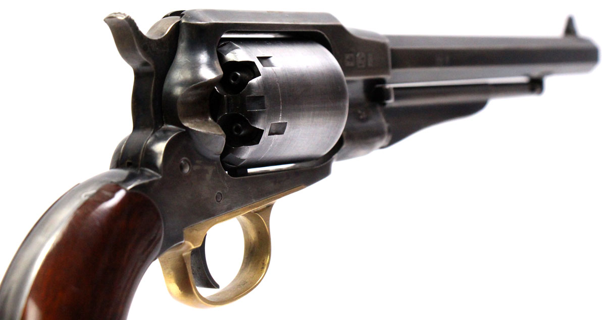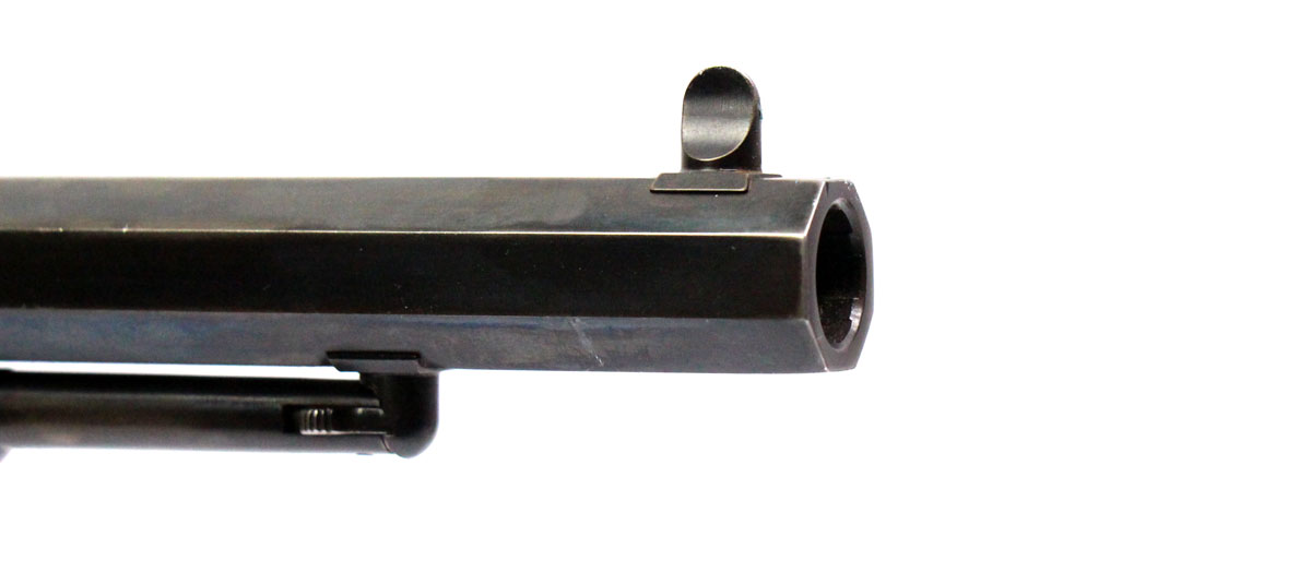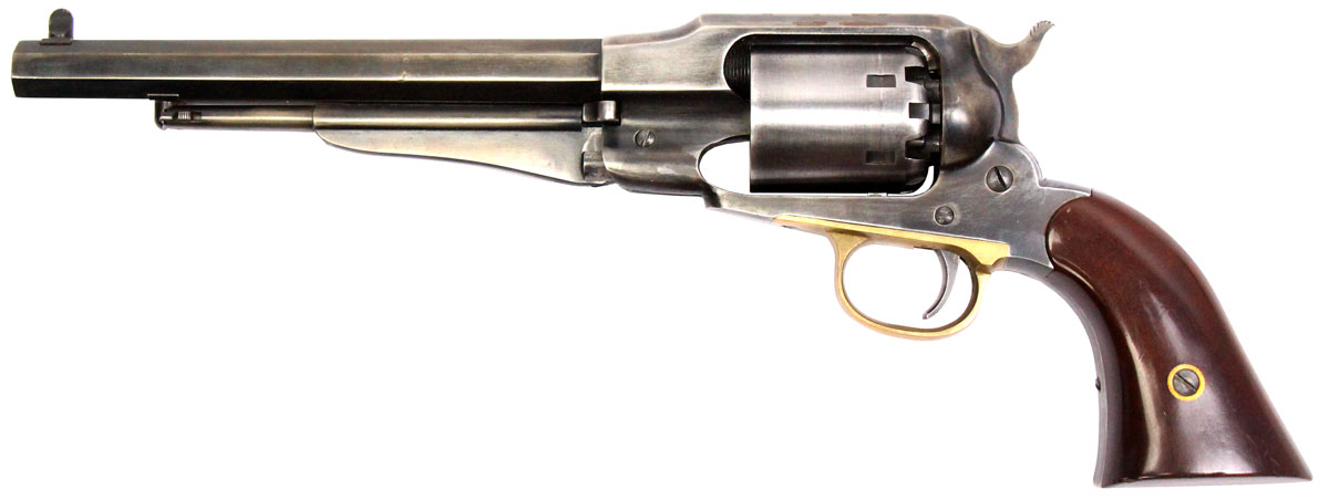 This is a used Uberti 1858 black powder revolver chambered for 44 caliber projectiles. It features an 8-inch octagonal barrel, 6-round cylinder, percussion ignition system, walnut grips, and aged finish. Overall, this revolver is in good condition with normal use cylinder draglines and some surface corrosion on the frame. This would be a good choice for recreational target shooting. Buy online today!