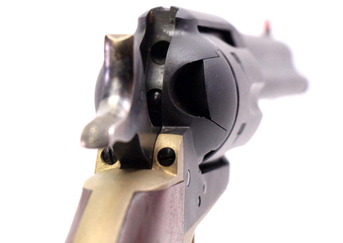 This is a used Uberti 1873 Cattleman revolver chambered in 357 Magnum. It features a 4.75-inch barrel, 6-round cylinder, notched rear sight, no transfer bar safety, wood grips, and matte black finish. Overall, this revolver is in good condition with normal use cylinder turn lines and handling wear on the grips. This would be a good choice for recreational target shooting. Buy online today!
