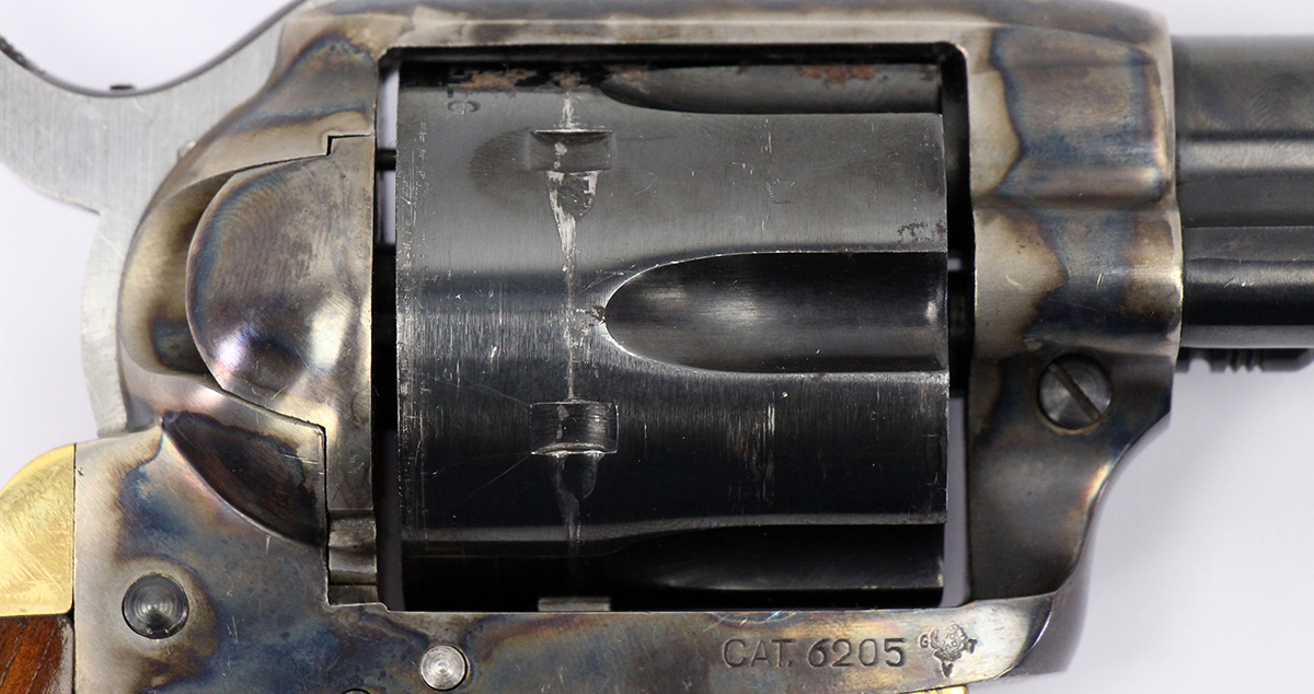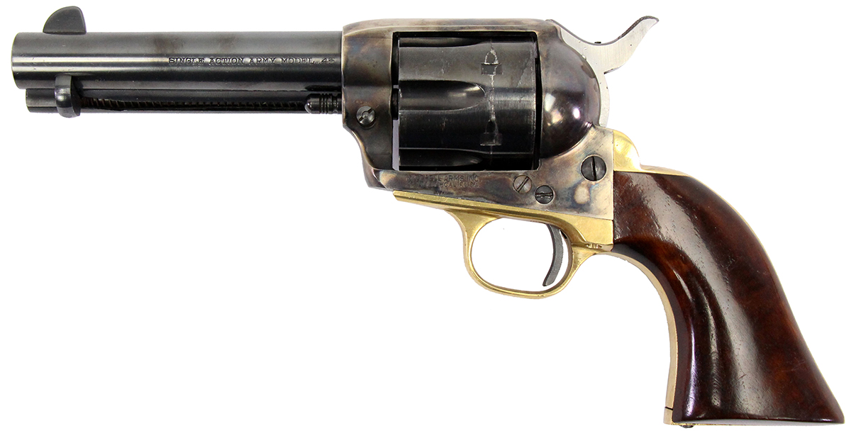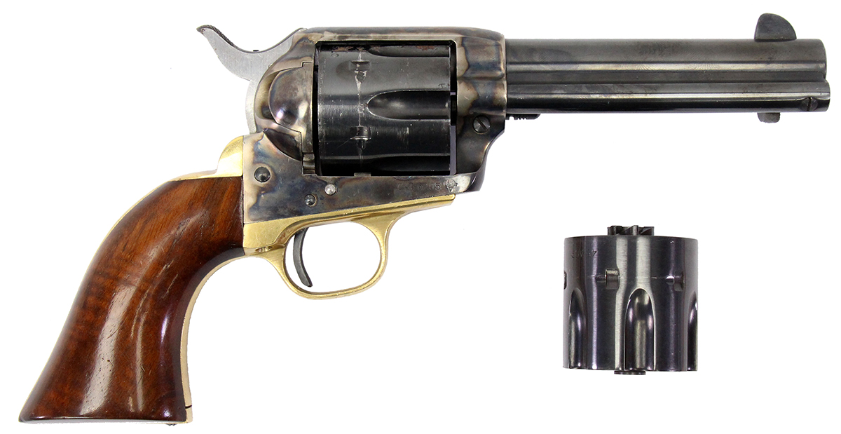 This is a used Uberti 1873 Cattleman revolver chambered in 45 Long Colt and 45 ACP. It features a 4.75-inch barrel, 6-round cylinders, case color finish, no transfer bar safety, and wood grips. Includes 45 Long Colt and 45 ACP cylinders. Overall, this Uberti is in good condition with normal-use cylinder draglines. The 45 Long Colt cylinder has some surface corrosion (see photos). This would be a good choice for recreational target shooting. Buy online today!