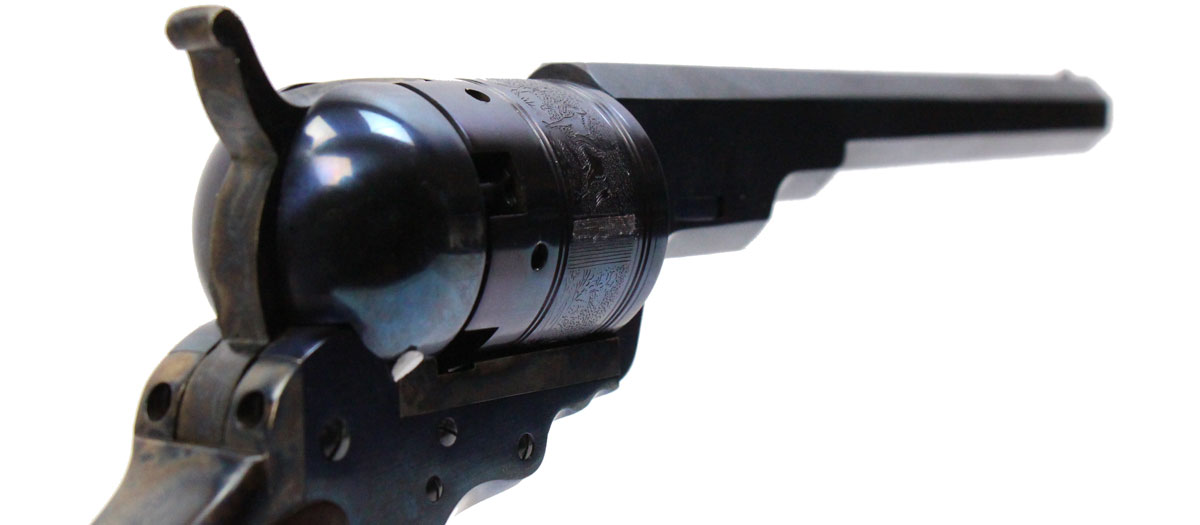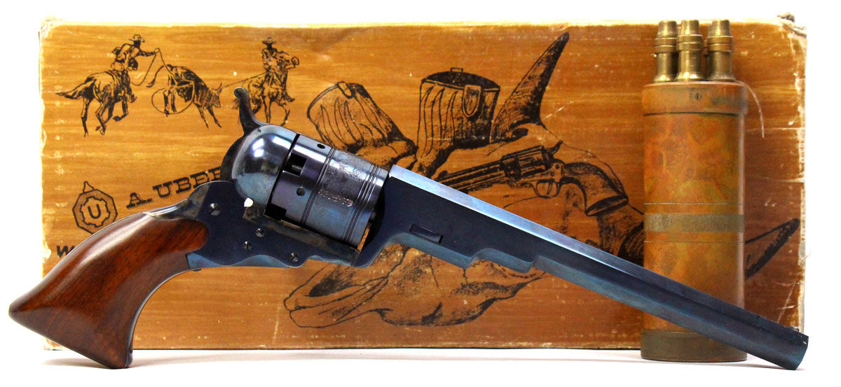 This is a used Uberti Paterson revolver chambered for 36 caliber projectiles. It features a 7.5-inch octagon barrel, 5-shot cylinder, folding trigger, walnut grips, case color frame, and fire blue finish. Includes factory box, manual, powder flask, and loading tool. Overall, this revolver is in good condition with some handling wear on the frame. This would be a good choice for classic gun enthusiasts. Buy online today!