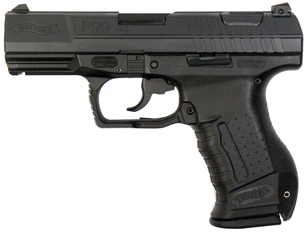 This is a used Walther P99 AS pistol chambered in 9mm. It features a 4-inch barrel, 15-round magazine, fixed sights, decocker, cocking indicator, paddle magazine release, and accessory rail. Includes factory box and three magazines. Overall, this pistol is in very good condition with minimal wear. This would be a good choice for home defense. Buy online today!