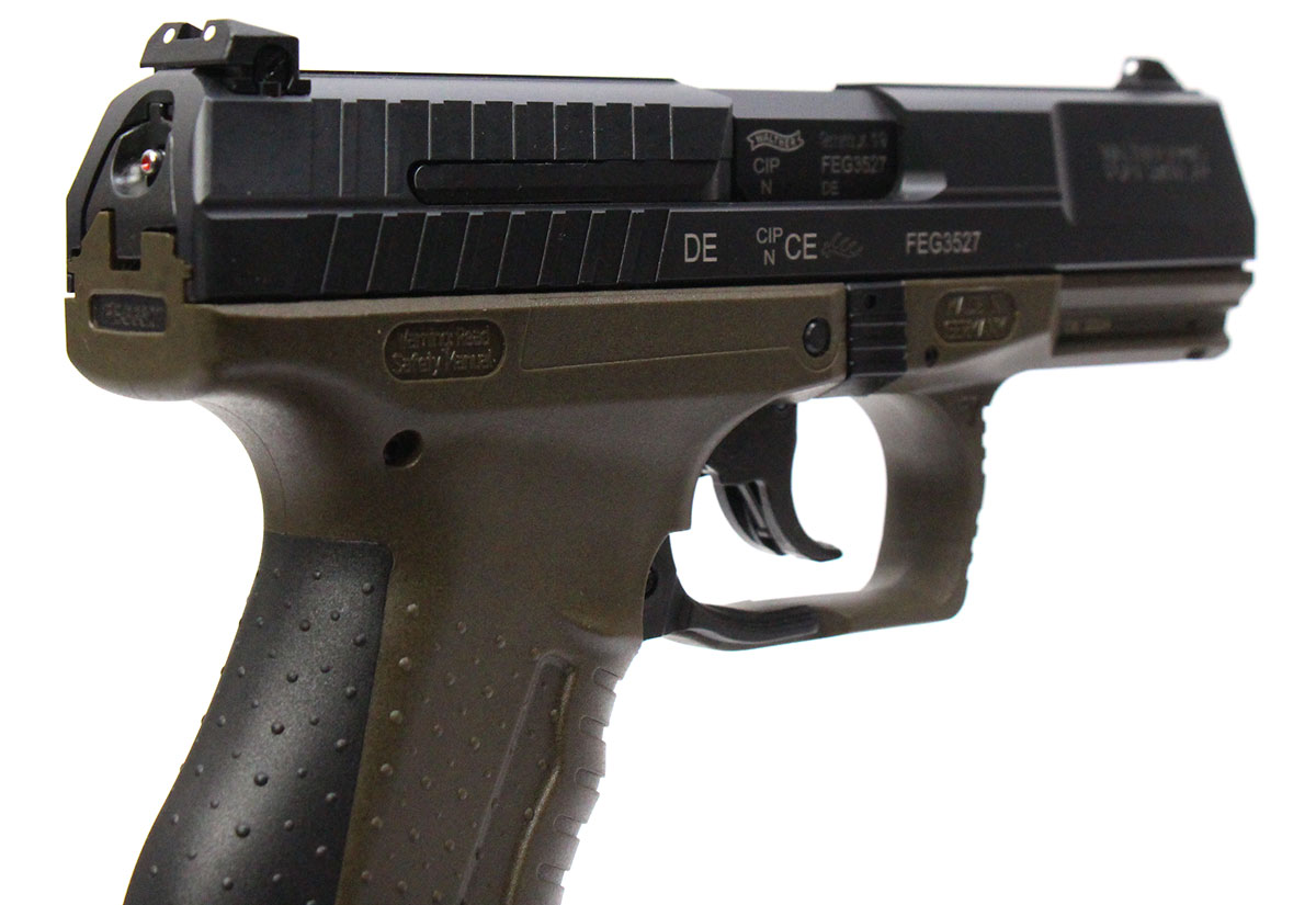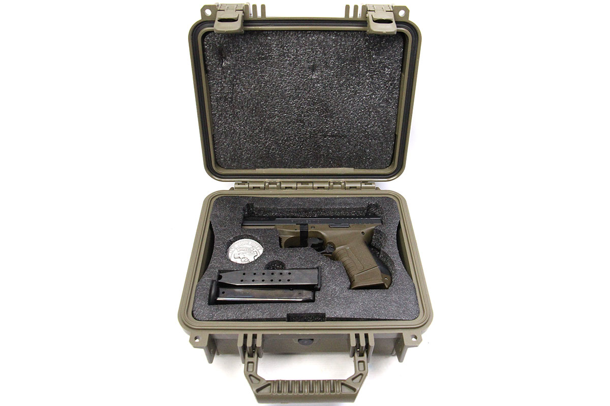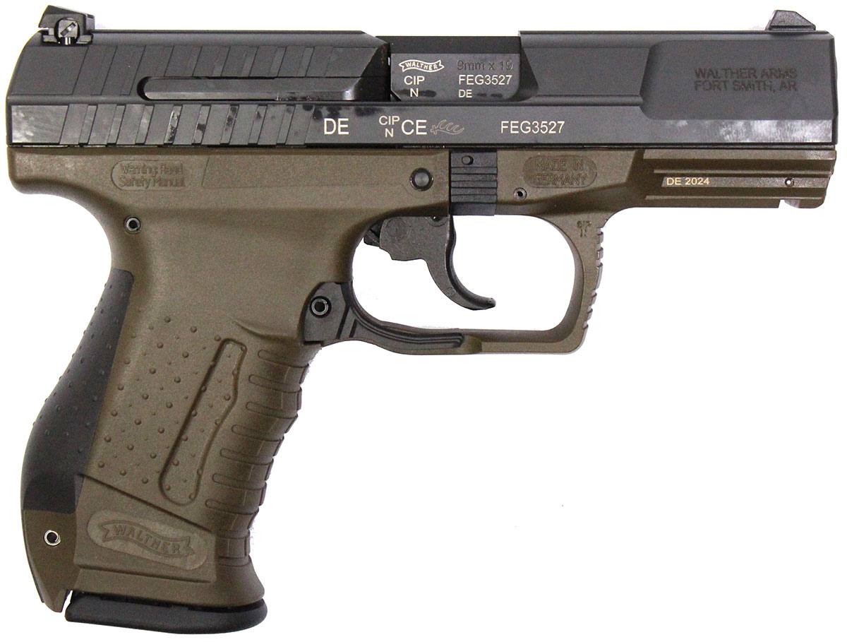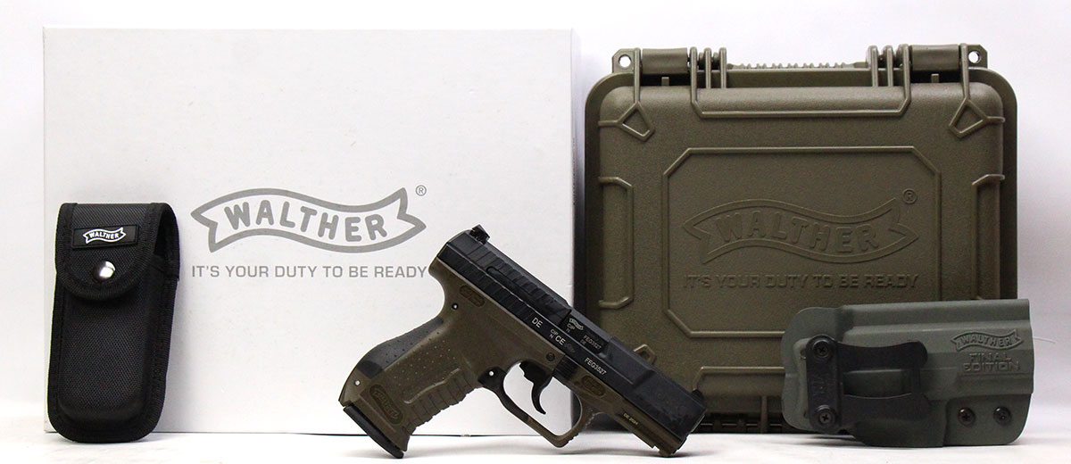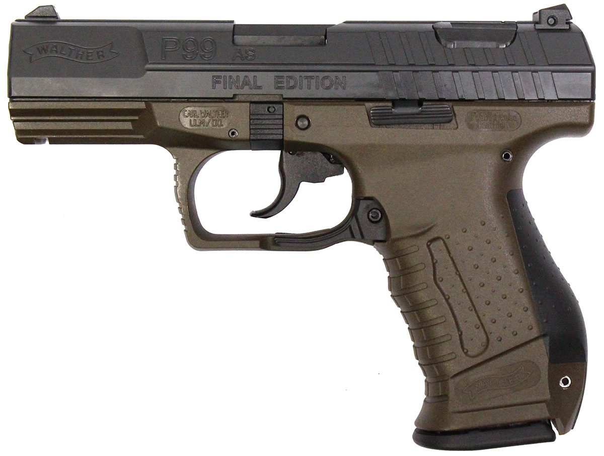 This is a used Walther P99 AS Final Edition pistol chambered in 9mm. It features a 4-inch barrel, 15-round magazines, fixed sights, decocker, cocking indicator, paddle magazine release, OD green frame, and accessory rail. Includes factory box, hard case, challenge coin, knife, kydex holster, backstrap set, and two magazines. Overall, this pistol is in very good condition with minimal wear. This would be a good choice for home defense. Buy online today!