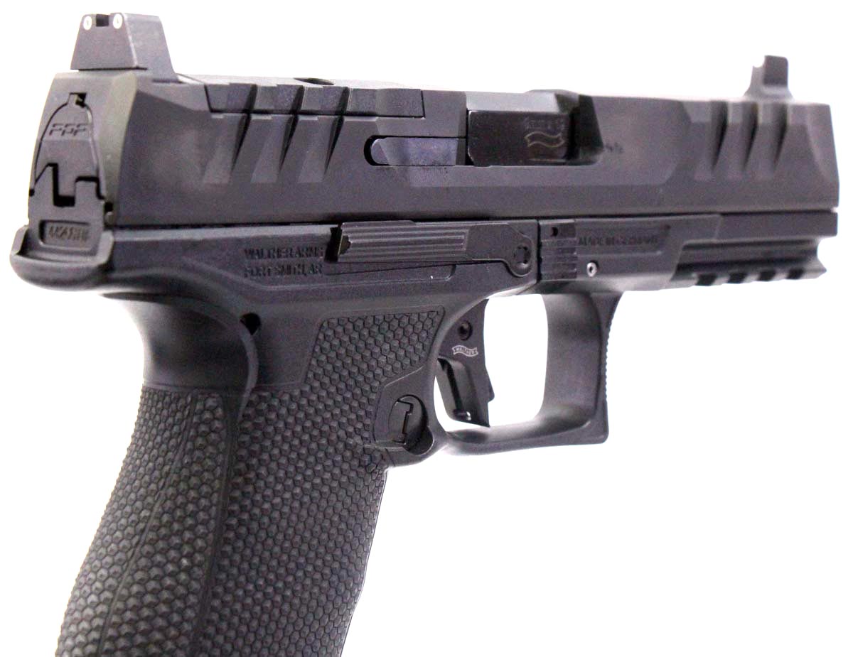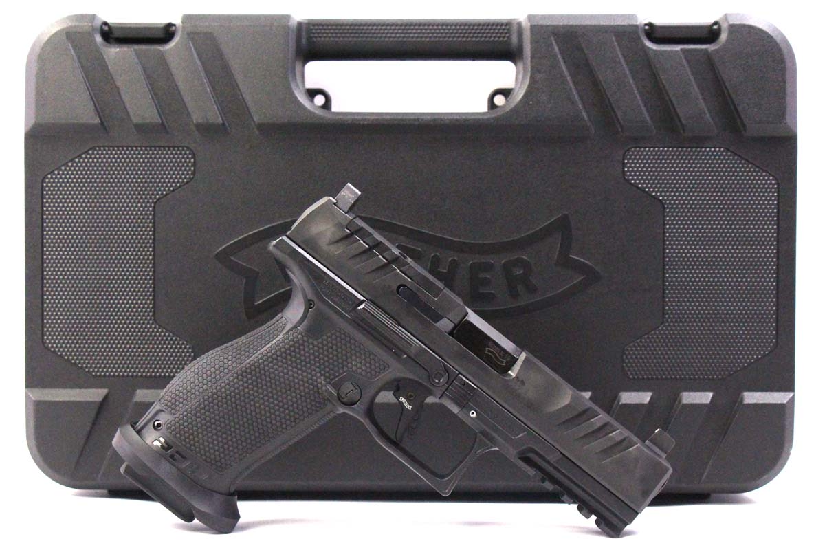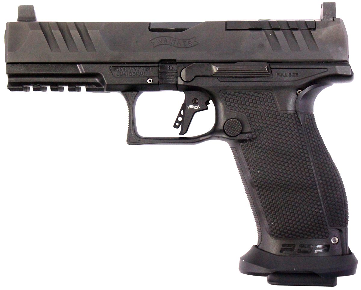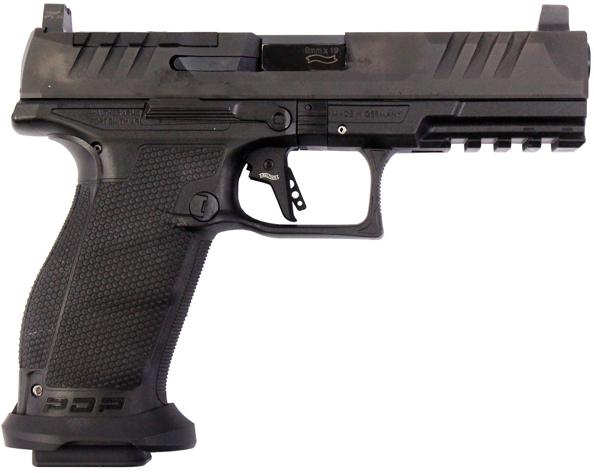 This is a used Walther PDP Pro-E pistol chambered in 9mm. It features a 4.5-inch barrel, 18-round magazines, Trijicon suppressor-height night sights, optics ready slide, flat-face trigger, flared magwell, and accessory rail. Includes factory box, manual, backstrap set, and three magazines. Overall, this pistol is in good condition with normal use wear on the slide and barrel. This would be a good choice for home defense. Buy online today!