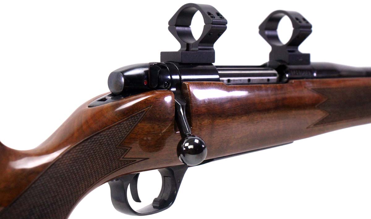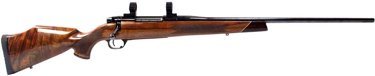This is a used Weatherby Mark V Deluxe rifle chambered in 257 Weatherby Magnum. It features a 24-inch barrel, 3-round hinged floorplate magazine, 1-inch scope rings, sling studs, blued finish, and walnut stock. Overall, this Weatherby is in good condition with some handling wear on the stock. Bore condition is good with crisp rifling. The receiver is marked "Paso Robles, CA Made in USA" on the left hand side. This would be a good choice for hunting. Buy online today!