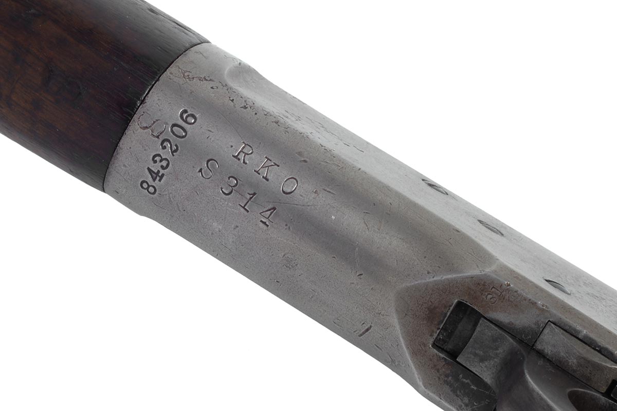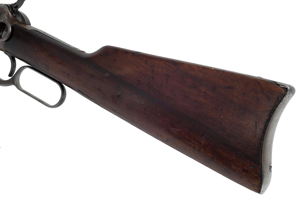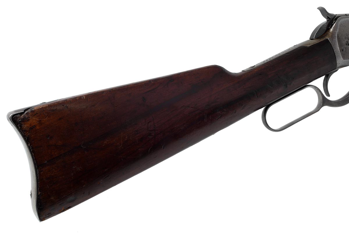 This is an original Winchester 1892 Saddle Ring Carbine movie-used prop gun. This rifle comes with a signed certificate of authenticity from Stembridge Gun Rentals, Inc that states this rifle was used in the classic television Westerns "Gunsmoke", "Bonanza", and "High Chaparral". The rifle is marked on the receiver "RKO S314" which indicates is was owned by Stembridge. The serial number indicates it was originally manufactured in 1918. Overall condition is fair. Mechanically everything works as it should, but most of the bluing is gone and the wood has many dings, scuffs, scratches, and pressure marks. The bore still has rifling, but it is very worn and frosted with some light pitting. This would be a great addition for anyone who collects Winchesters, movie prop guns, or vintage Western cinema memorabilia. Buy online today!