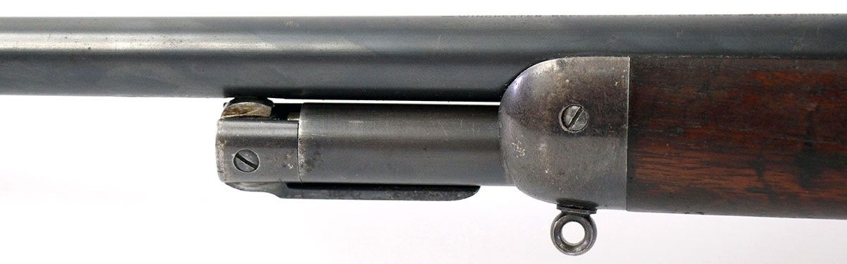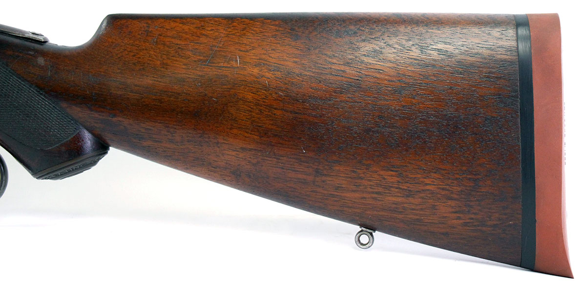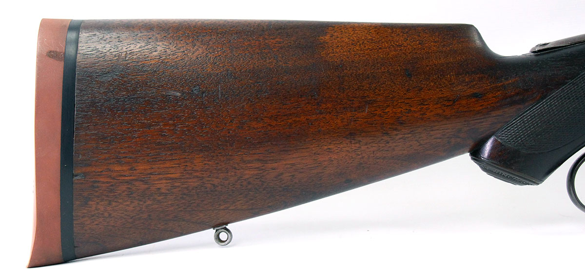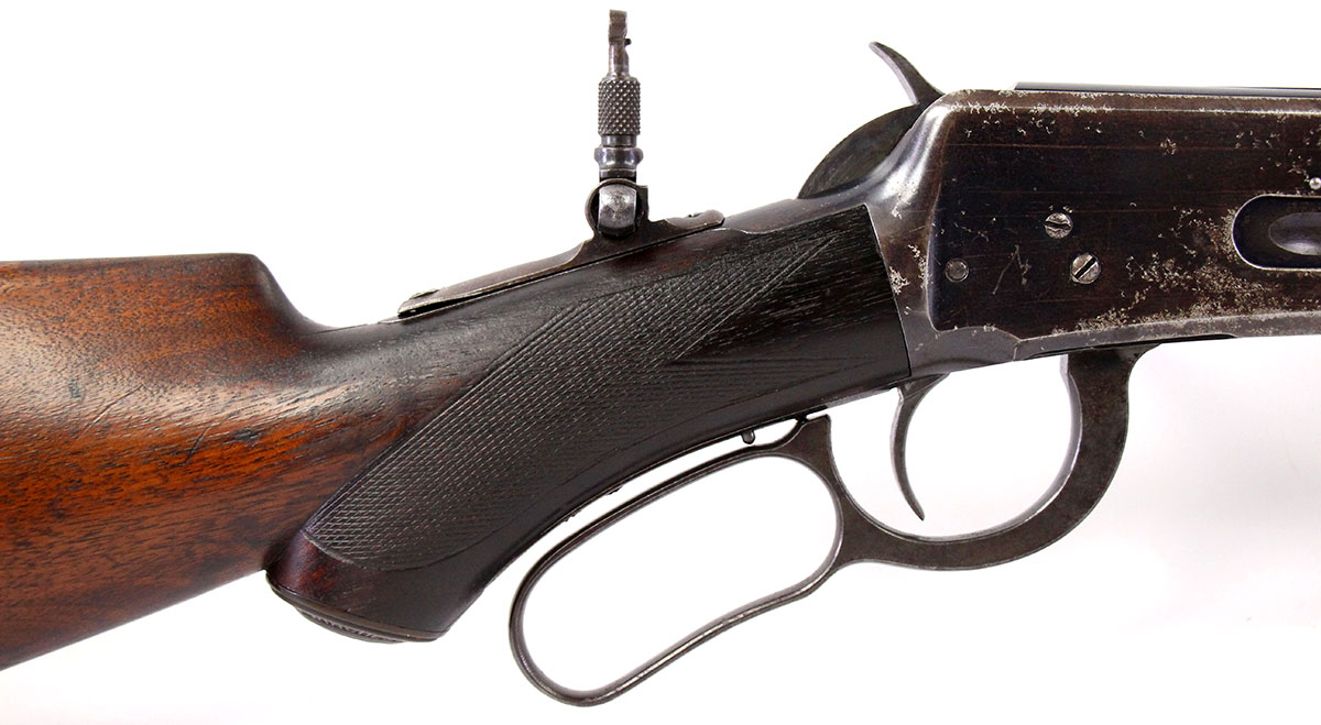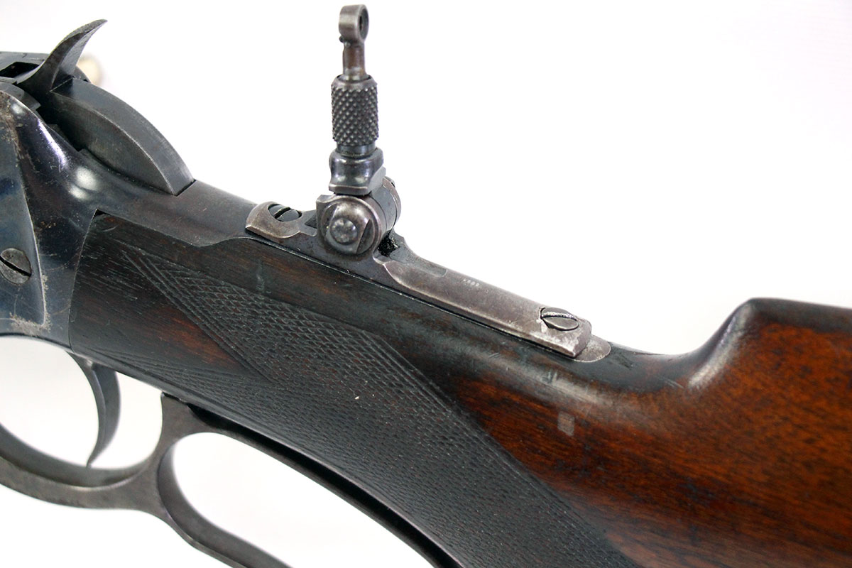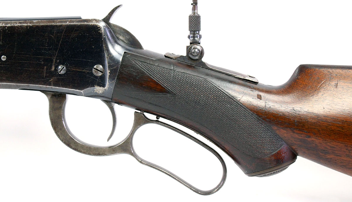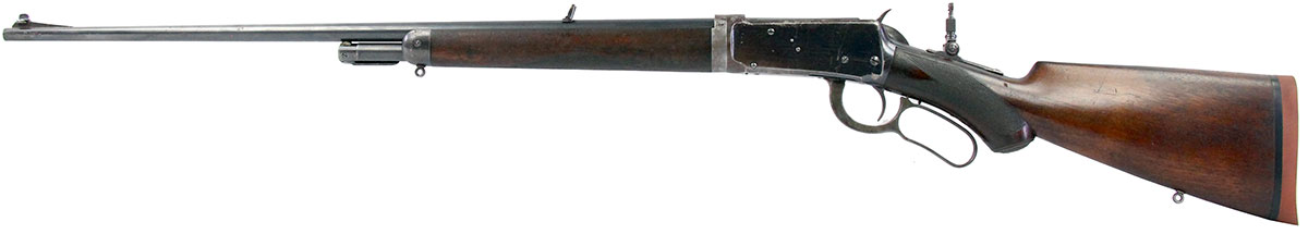 This is an Antique Winchester 1894 Deluxe Takedown rifle chambered in 30 WFC. It features a 25.5-inch round barrel, tang peep sight, Marble No. 3 front sight, 4-round half-length tube capacity, and takedown style action. This Winchester has had a new pad installed to the butt plate. The bore is in good condition with strong rifling but has a brown patina throughout the finish. There is significant cosmetic wear throughout the finish on barrel, action, forend, and stock. This Winchester does pass simple function checks. Overall, this would be a good choice for collectors.