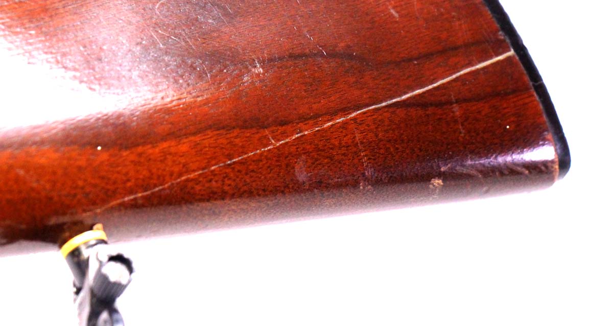 This is a used Winchester 94 rifle chambered in 30-30 Winchester. It features a 20-inch barrel, adjustable rear sight, hooded front sight, blued finish, and straight grip stock. Overall, this Winchester is in fair condition with significant pitting throughout the receiver. The stock is cracked near the toe. Bore condition is good with strong rifling. Based on serial range, this Winchester was manufactured in 1973. This rifle is being sold as -is.