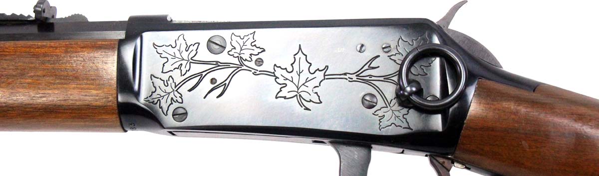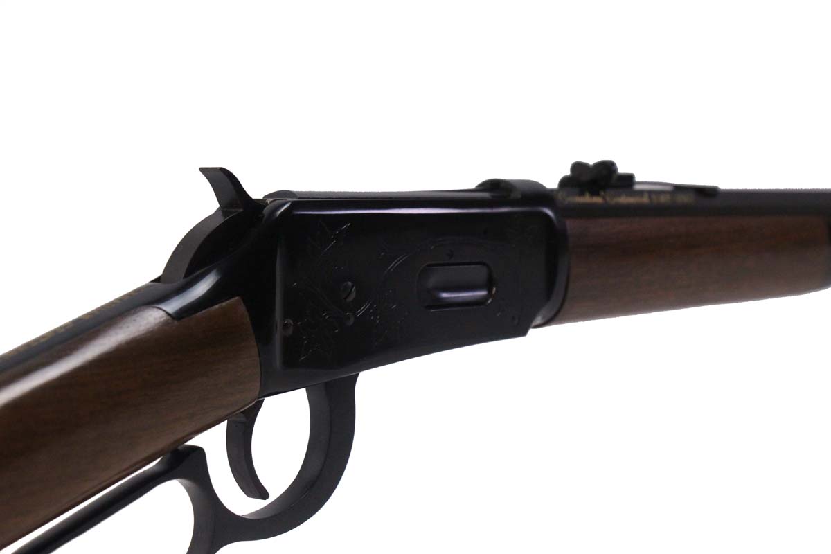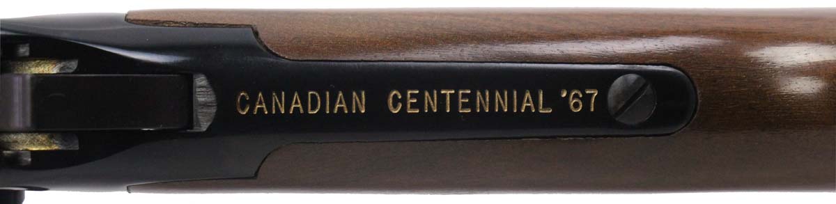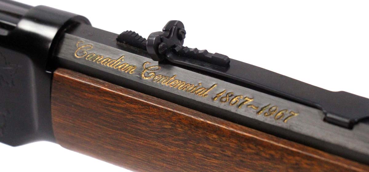 This is a collectible Winchester 94 Canadian Centennial rifle chambered in 30-30 Winchester. It features a 20-inch octagonal barrel, 7-round tube magazine, adjustable rear sight, factory engraved receiver, blued finish, and walnut stock. Includes factory box. Overall, this Winchester is in good condition with some handling wear on the barrel. Bore condition is good with crisp rifling. This would be a good choice for collecting. Buy online today!