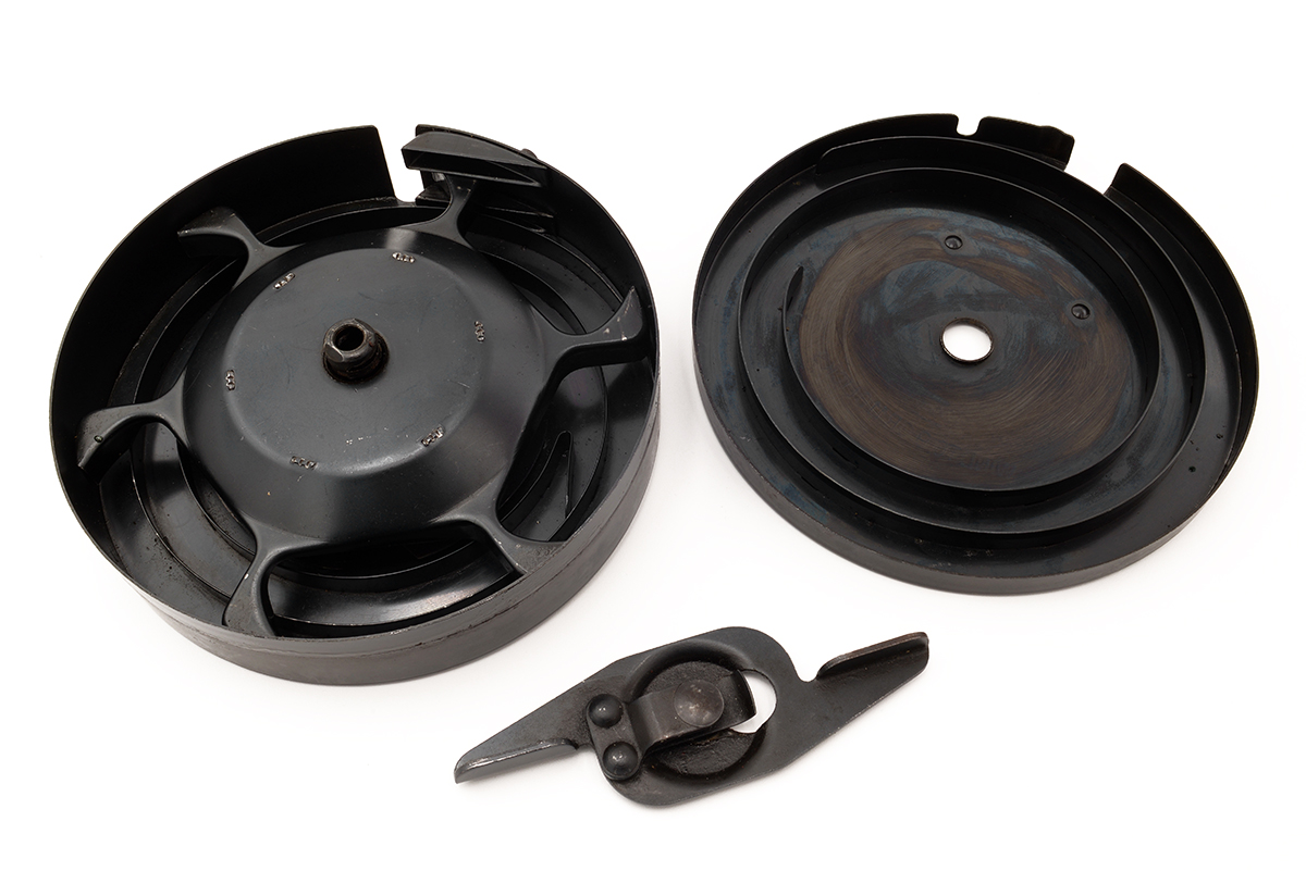 This is a WW2 era Auto Ordnance M1928A1 "Type L" drum magazine for the Thompson Sub Machine Gun. It features a 50 round capacity of 45ACP ammo and is marked "MAGAZINE TYPE "L" THOMPSON SUBMACHINE GUN 50 CARTRIDGES CAL 45 FOR 1928 MODEL WIND TO 9 OR 11 CLICKS" on the front face plate. The back face plate is marked "AUTO-ORDNANCE CORP. BRIDGEPORT CONNECTICUT REGISTERED IN THE U.S PATEENT OFFICE" with a "U" below which indicates this is a second series drum manufactured by United Specialties in probably about 1941 or after. Overall condition is good with some light scratches and light wear, seems to be in perfect working order. Buy online today!