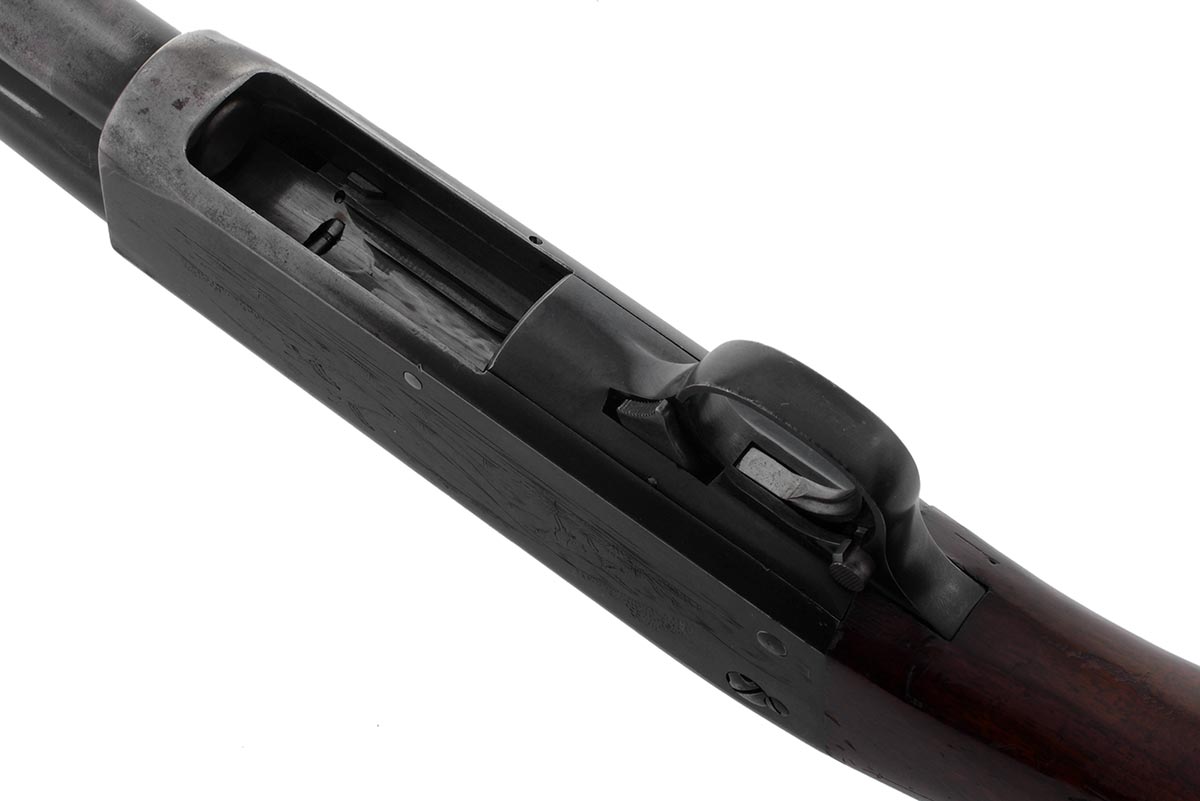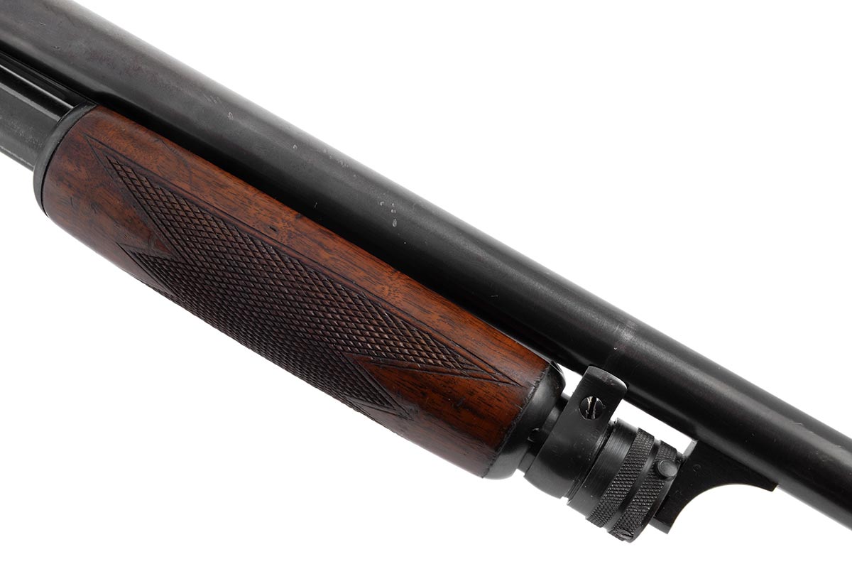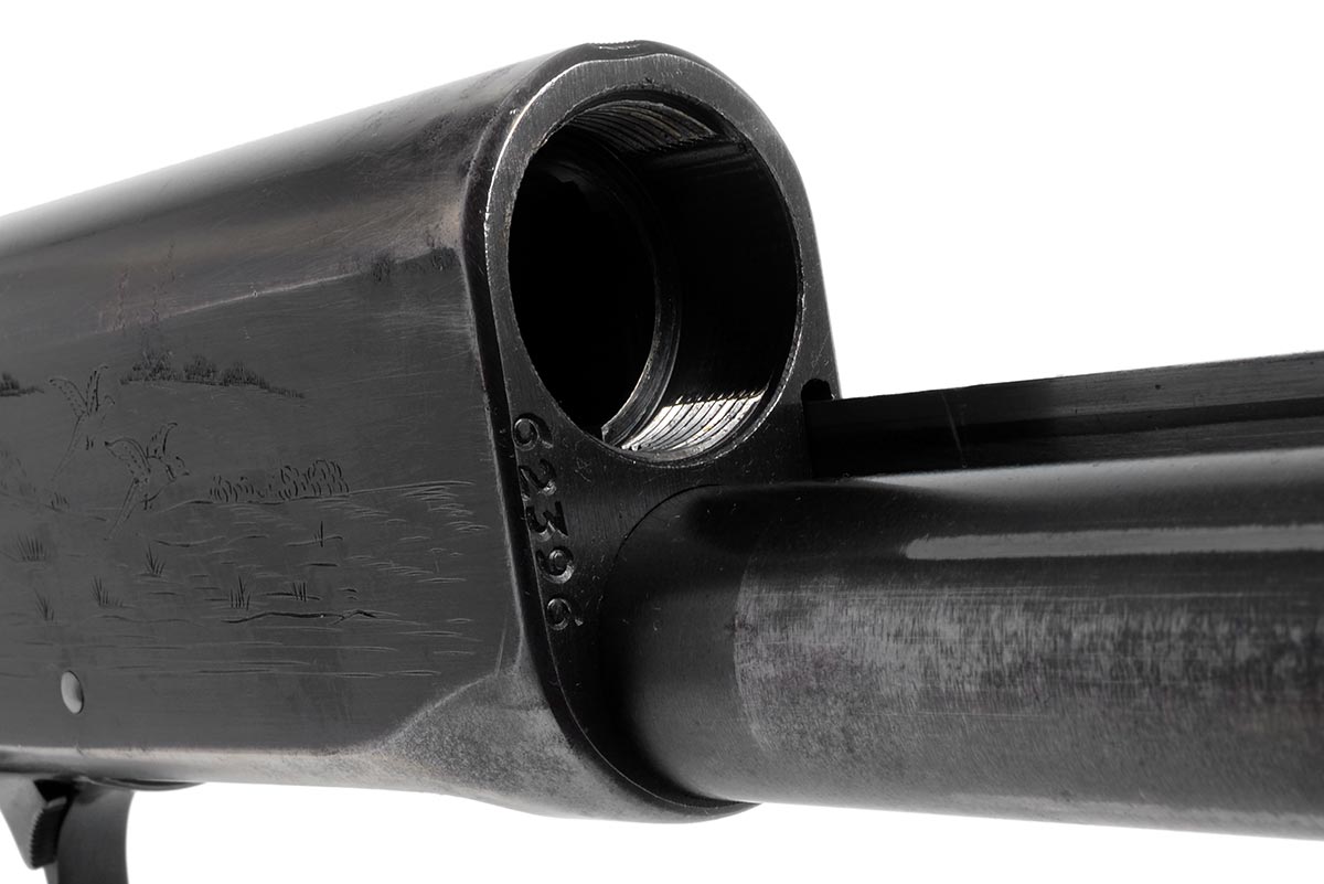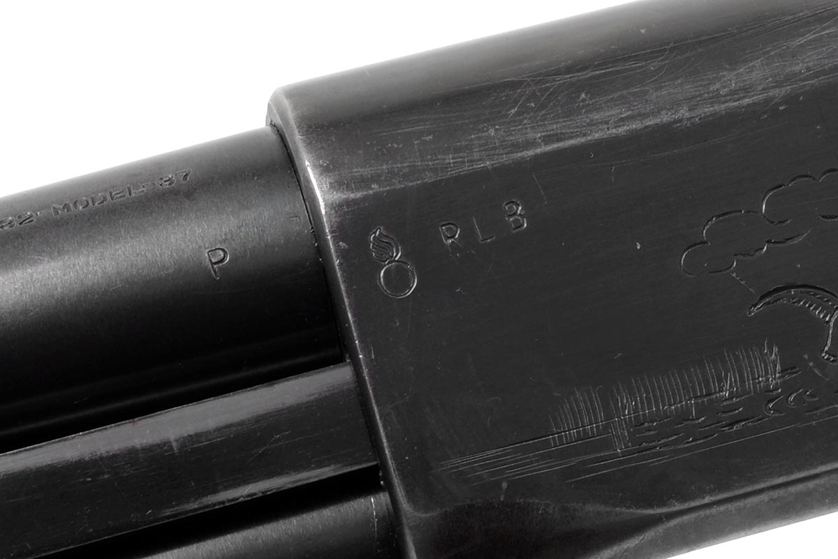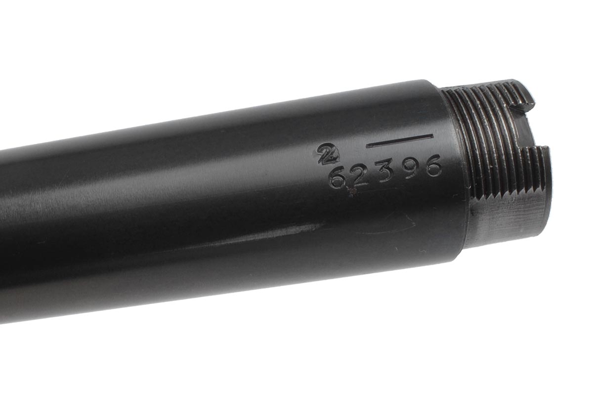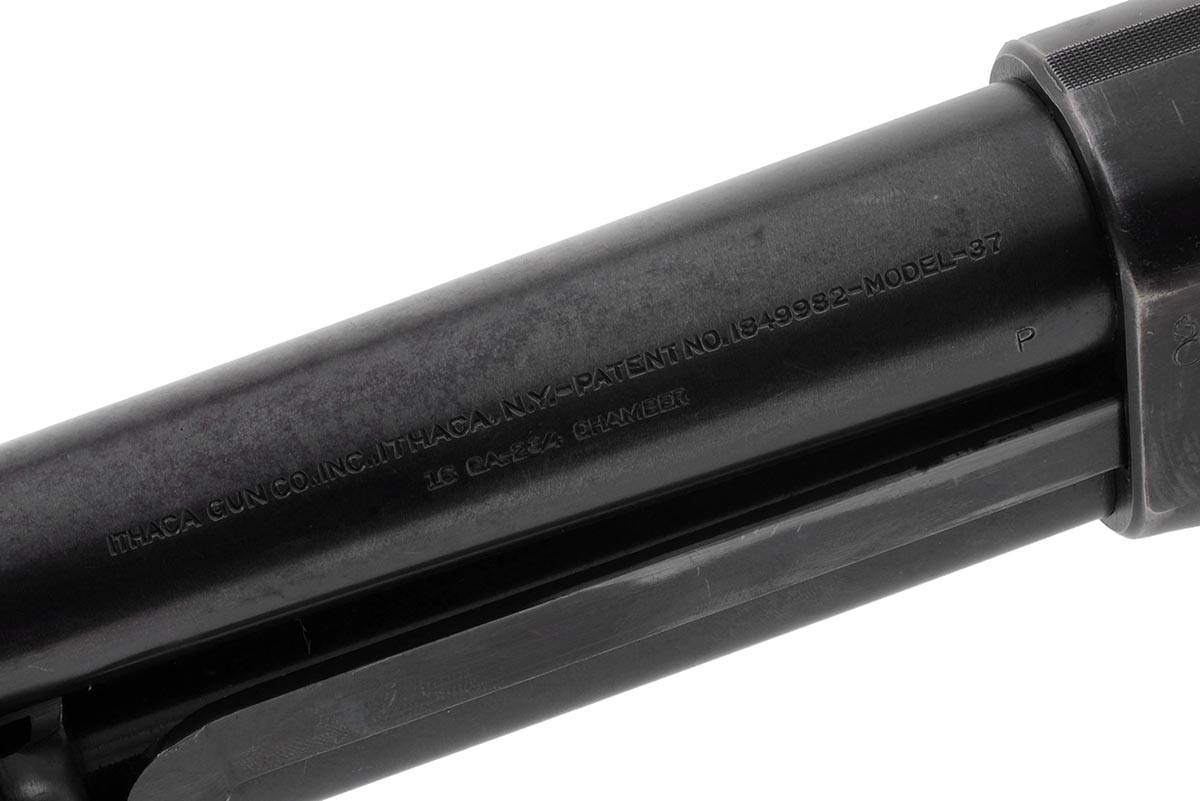 This is a WW2 USGI Ithaca Model 37 Featherlight shotgin chambered in 16 gauge. It features a 28-inch barrel, 2-3/4-inch chamber, blued finish, checkered walnut furniture, engraved game scene receiver, and 4-round magazine tube. The serial number indicates this shotgun was manufactured in 1942. The left side of the receiver is marked with a U.S ordnance "flaming bomb" insignia and "R.L.B" (Lt. Col. Roy L Bowlin) inspector initials. The barrel has a matching serial number and is marked with “P” proof stamp. Military-issue Ithaca Model 37s chambered in 16 gauge are extremely scarce. The gauge and 28-inch barrel length suggests this was most likely used for training purposes and not combat. Shotguns such as this were used on bases to teach bomber gunners how to track targets by learning skeet shooting. This shotgun is in good mechanical condition with a bright shiny bore. There is a fair amount of wear and to the bluing, especially to the receiver along with scratches and patina. The wood is in nice condition with very little wear to the checkering, and there are some scuffs, dings, and pressure marks. This would make a great addition to a WW2 firearms collection. Buy online today!