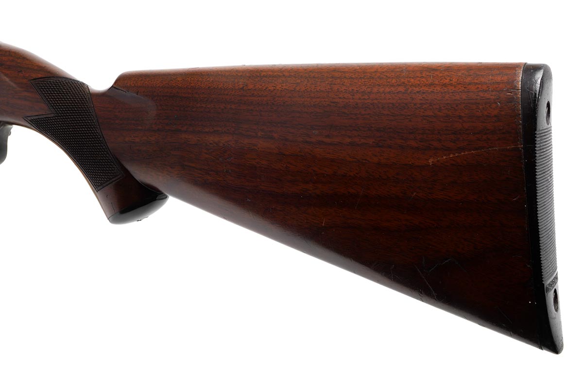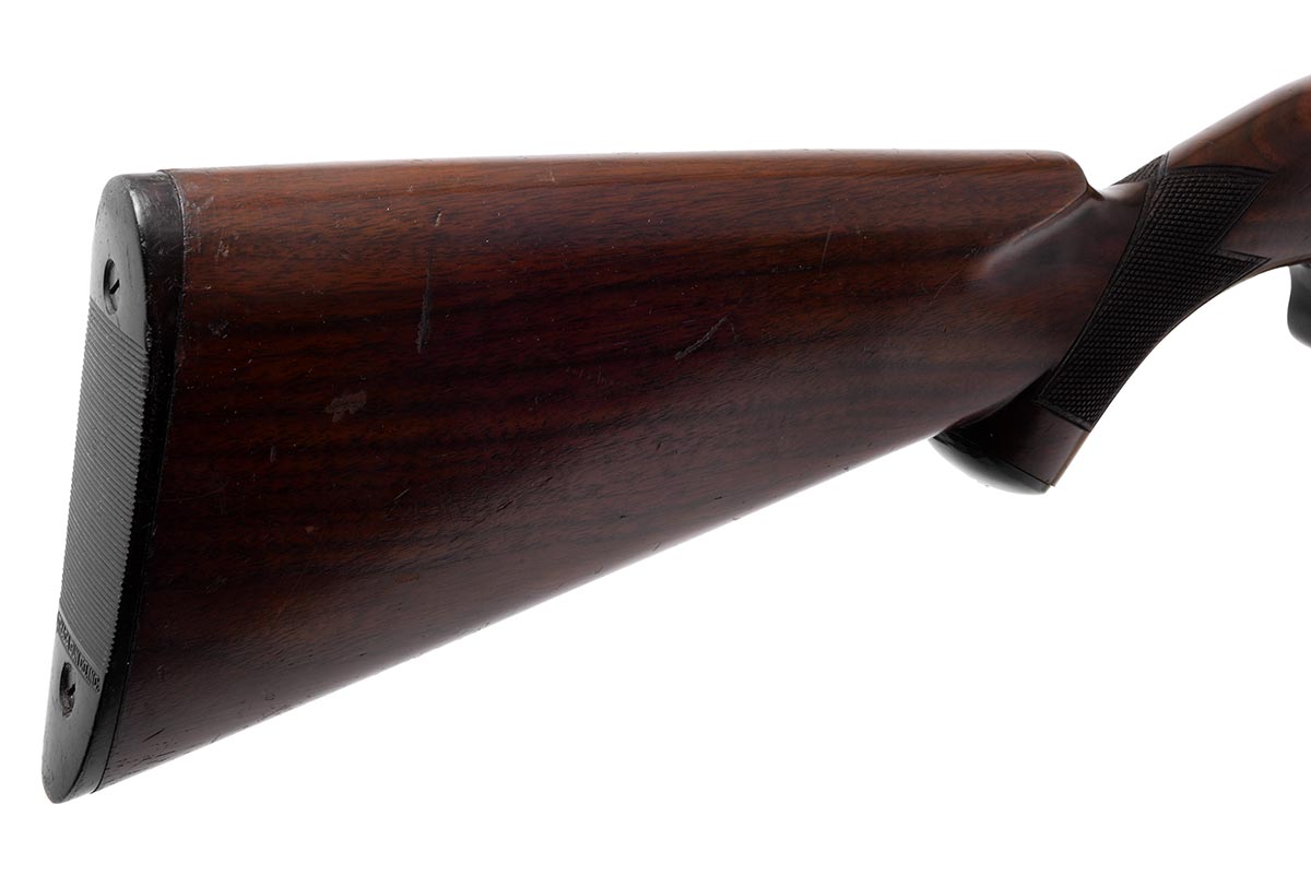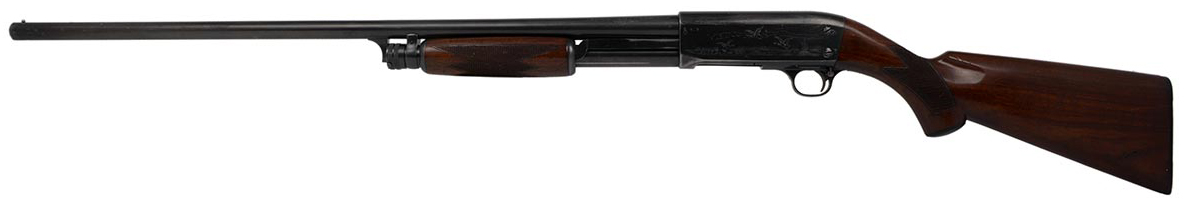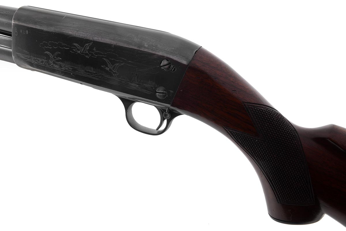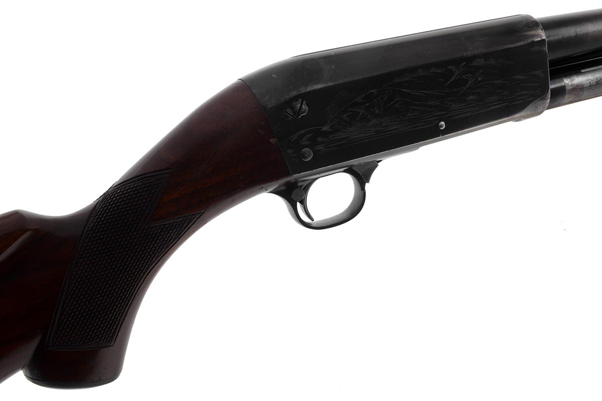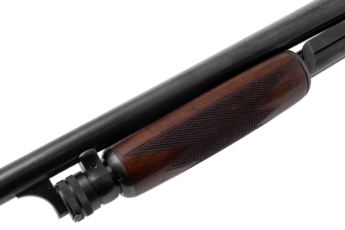 This is a WW2 USGI Ithaca Model 37 Featherlight shotgin chambered in 16 gauge. It features a 28-inch barrel, 2-3/4-inch chamber, blued finish, checkered walnut furniture, engraved game scene receiver, and 4-round magazine tube. The serial number indicates this shotgun was manufactured in 1942. The left side of the receiver is marked with a U.S ordnance "flaming bomb" insignia and "R.L.B" (Lt. Col. Roy L Bowlin) inspector initials. The barrel has a matching serial number and is marked with “P” proof stamp. Military-issue Ithaca Model 37s chambered in 16 gauge are extremely scarce. The gauge and 28-inch barrel length suggests this was most likely used for training purposes and not combat. Shotguns such as this were used on bases to teach bomber gunners how to track targets by learning skeet shooting. This shotgun is in good mechanical condition with a bright shiny bore. There is a fair amount of wear and to the bluing, especially to the receiver along with scratches and patina. The wood is in nice condition with very little wear to the checkering, and there are some scuffs, dings, and pressure marks. This would make a great addition to a WW2 firearms collection. Buy online today!