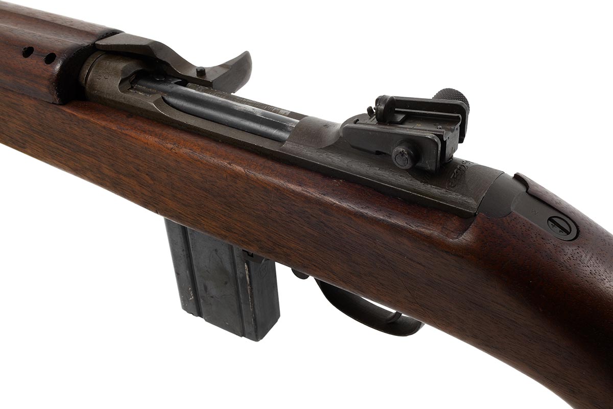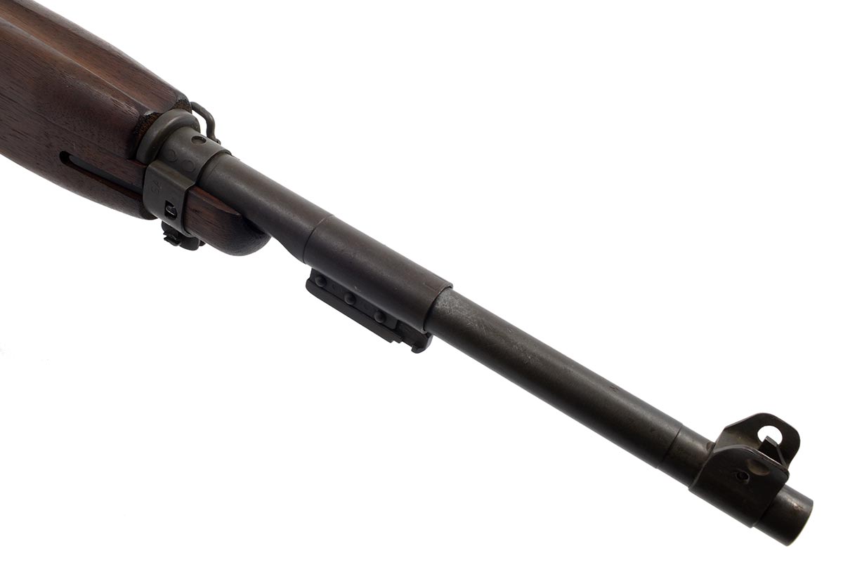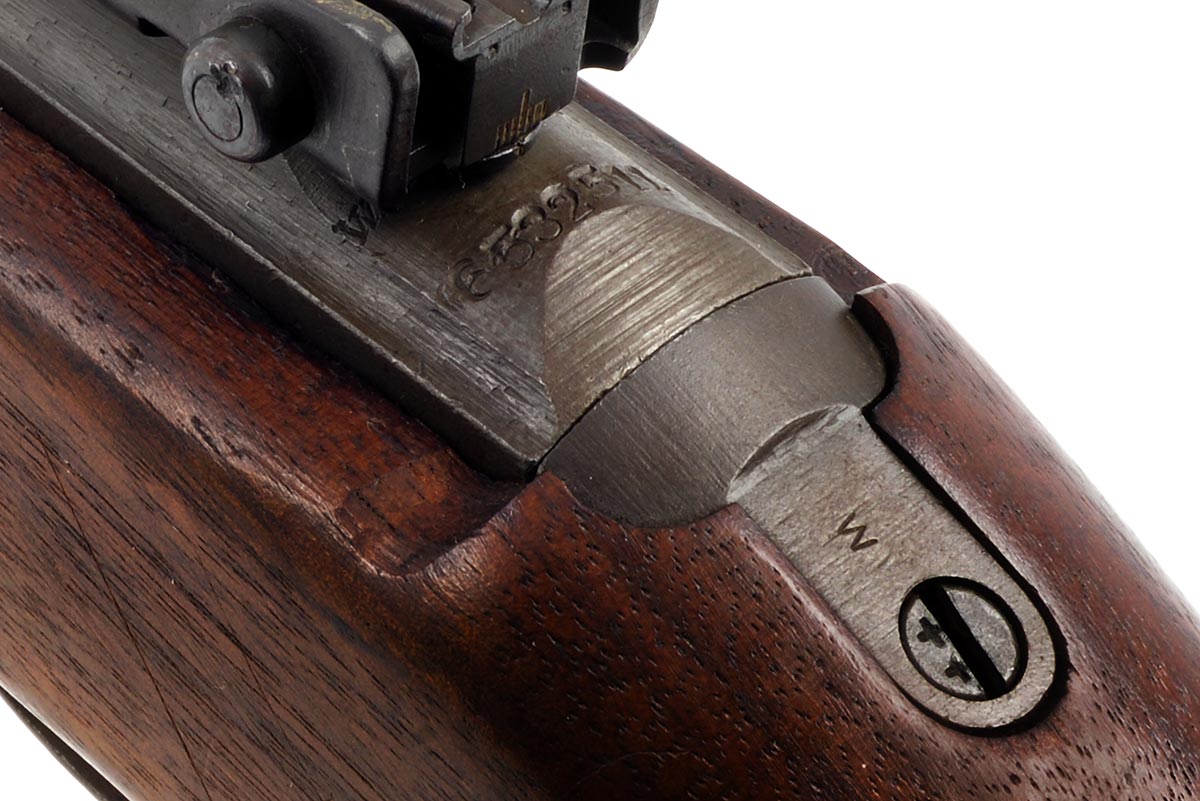 This is a WW2 Winchester M1 Carbine chambered in 30 Carbine. It features an 18-inch barrel, parkerized finish, bayonet lug, low wood stock, 4-rivet handguard, and 15-round magazine. The serial number indicates this rifle was manufactured between November of 1944 and January of 1945. All parts appear to be correct for this rifle and late war Winchester M1s would have been fitted with a bayonet lug front barrel band and Type II milled rear sight. A complete list of the parts on this rifle are listed below. Overall condition is good; the bore has nice shine and sharp rifling. The finish is original and there is minimal wear. The stock is in very nice shape with a clear crossed-cannons ordnance acceptance cartouche on the right side and a very small "W" stamp inside the sling channel. This would make a great addition to any WW2 firearms collection. Buy online today!